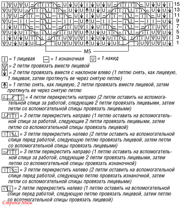 Число петель кратно 15 + 1 + 2 кромочные = вязать согл. схеме. На ней даны лицевые ряды. В изнаночных рядах петли провязывать по рисунку, накиды провязывать изнаночными. Начать с 1 кромочной и петель перед раппортом, раппорт постоянно повторять, закончить петлями после раппорта и 1 кромочной. Постоянно повторять 1—16-й ряды.