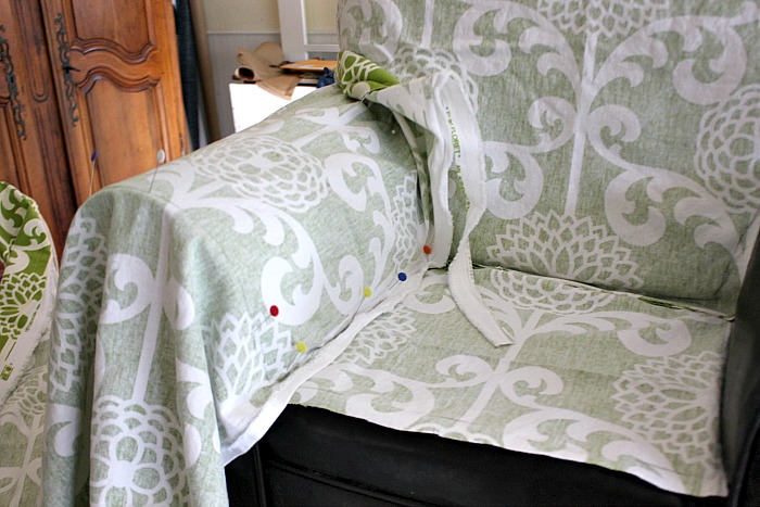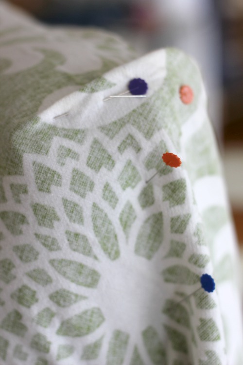 Первой частью драпировки была эта спинка выше. Я убедился, что моя ткань была НА ЗЕРНОМ, и что мне понравилось размещение шаблона, прежде чем я начал пиннинг. Сначала я приколол с вершины, затем начал заправлять внизу и углы.