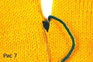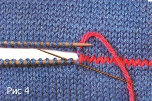 4. Введите иглу с изнаночной стороны снова в первую петлю верхней части. Вытяните нить. |