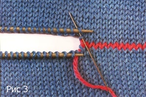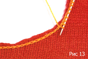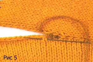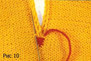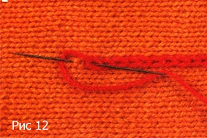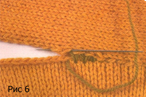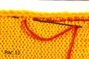 Соединяя открытые и закрепленные петли изнаночной глади, подхватывайте то две вертикальные стенки петли у кромки с закрытыми петлями, то соответствующую открытую петлю. |