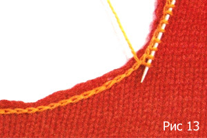3. Введите иглу с изнаночной стороны в следующую петлю нижней части. Вытяните нить. |