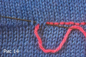 3. Соединяя петли с рядами на изнаночной стороне, подцепите дугу изнаночной петли на верхней части, как показано на рисунке. |