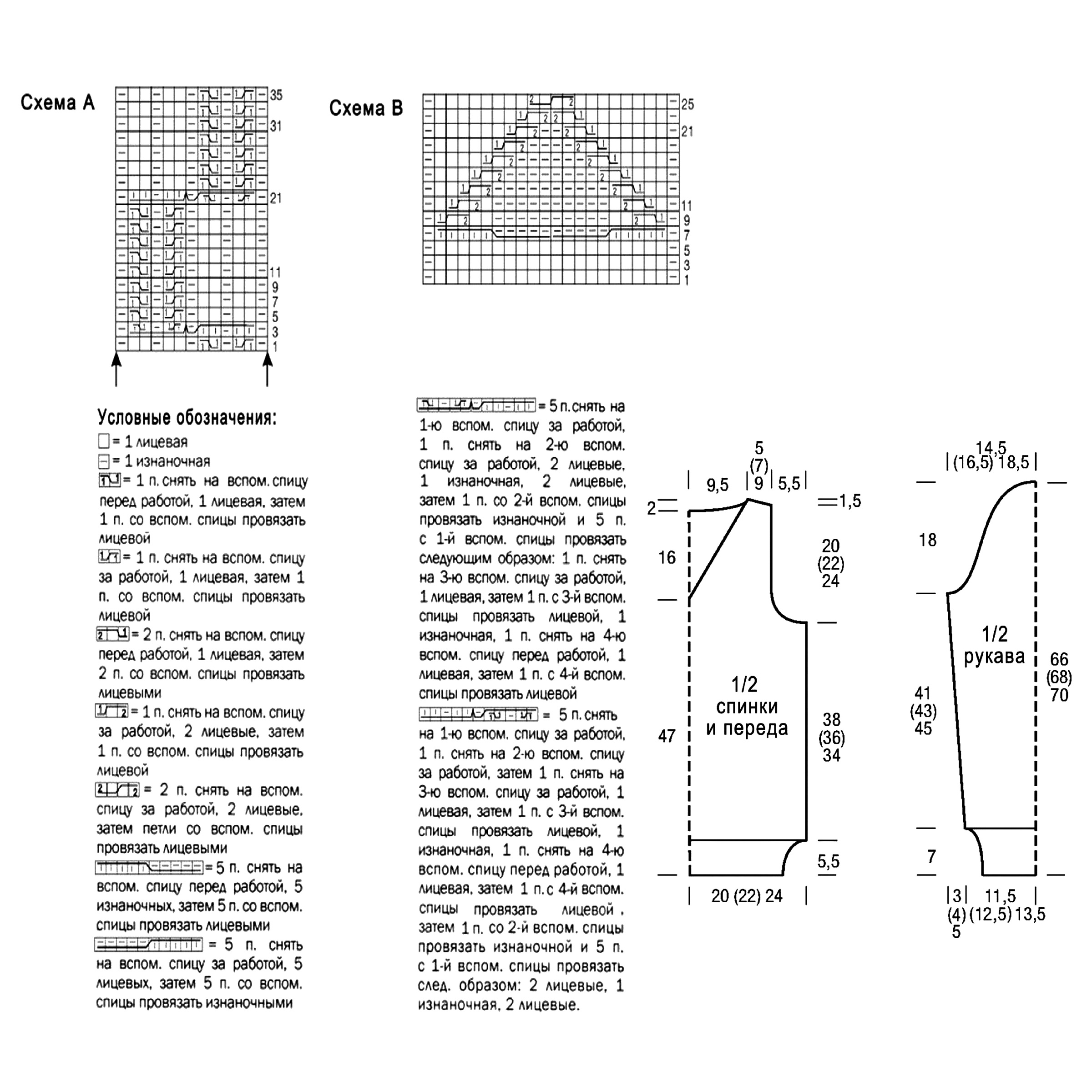 Перед. Вязать как спинку, но для V-образного выреза горловины через 41 см = 120 рядов от планки на 22 петлях центральной «косы» выполнять 25-й и 26-й ряды схемы В.