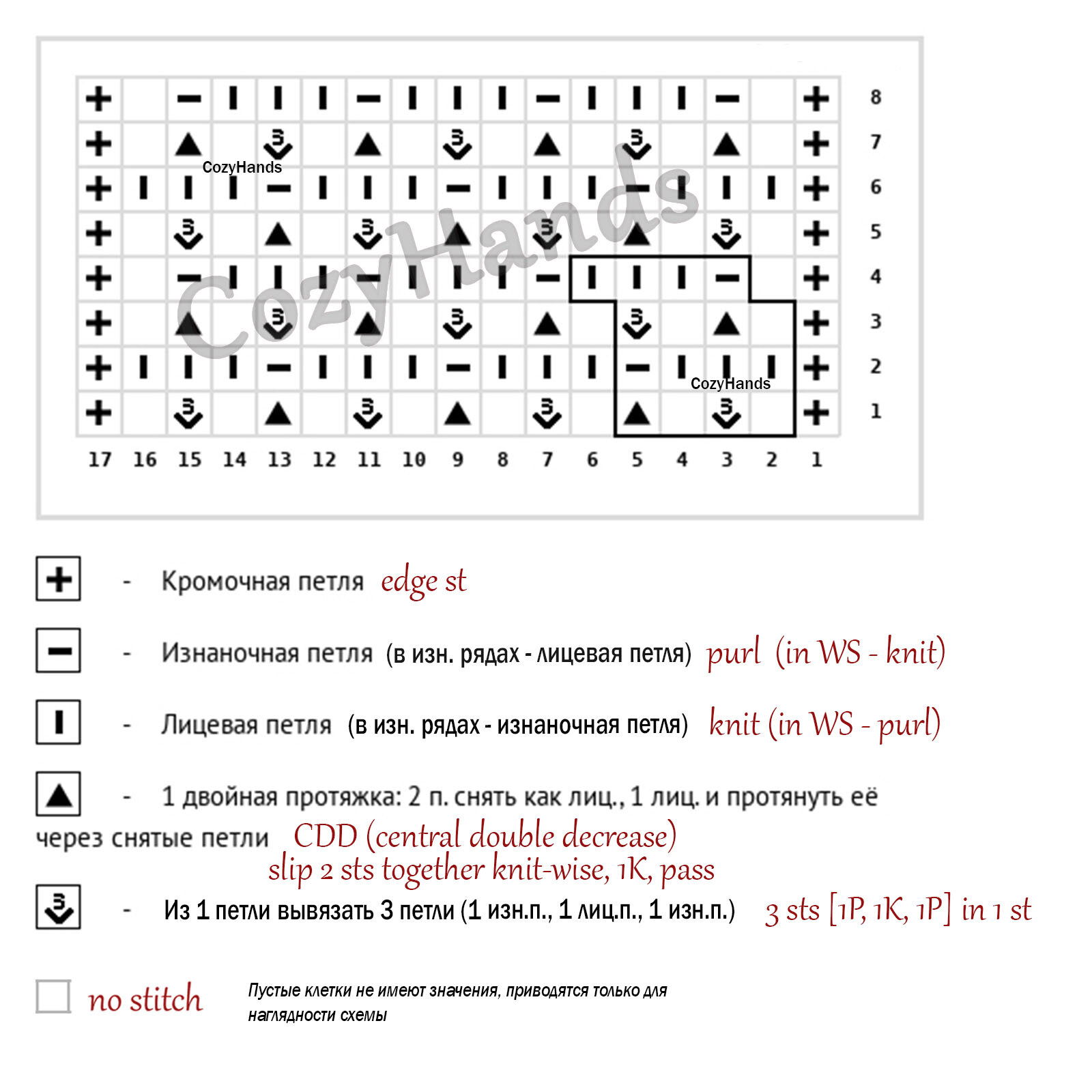 Схема узора, описание вязания поворотными рядами и по кругу в этой статье:
