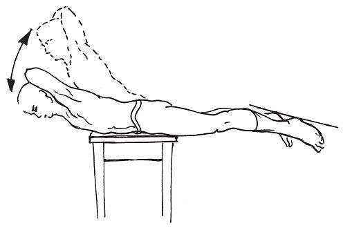 8. Лежа животом на табурете, с ногами, закрепленными за кровать или другой предмет, максимальные прогибания туловища назад