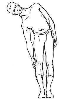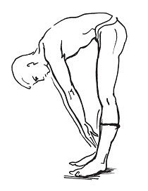 2. Стоя, наклоны вперед на прямых ногах с касанием пальцами рук пола. Облегченный вариант: ноги слегка согнуты в коленях, касание пальцами рук лодыжек. Для увеличения гибкости позвоночника, профилактики остеохондроза.