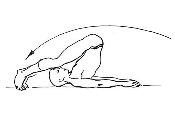 Это йоговский «плуг», повторяемый многократно. Облегченный вариант: упражнение выполняется лежа головой к стене до касания ее носками стоп. Для позвоночника и мышц брюшного пресса.