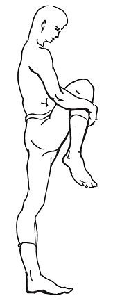 7. В положении стоя поочередное максимальное подтягивание ног к животу. Для тазобедренных суставов и стимуляции кишечника.