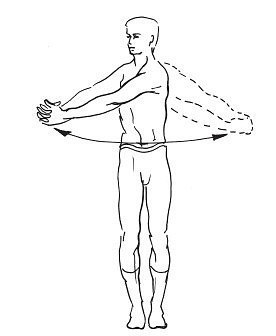 3. Стоя, вращательные движения руками в плечевых суставах. Для улучшения функции плечевых суставов и грудного отдела позвоночника.
