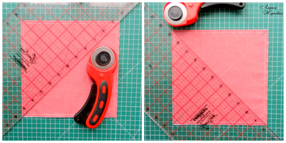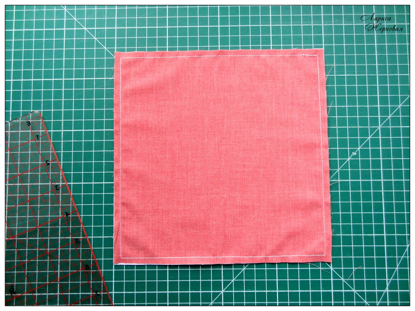 Если необходимо подрезаем неровности, т.е. делаем квадраты идеальными. Теперь кроим еще 4 квадрата из белой ткани, равные остальным.