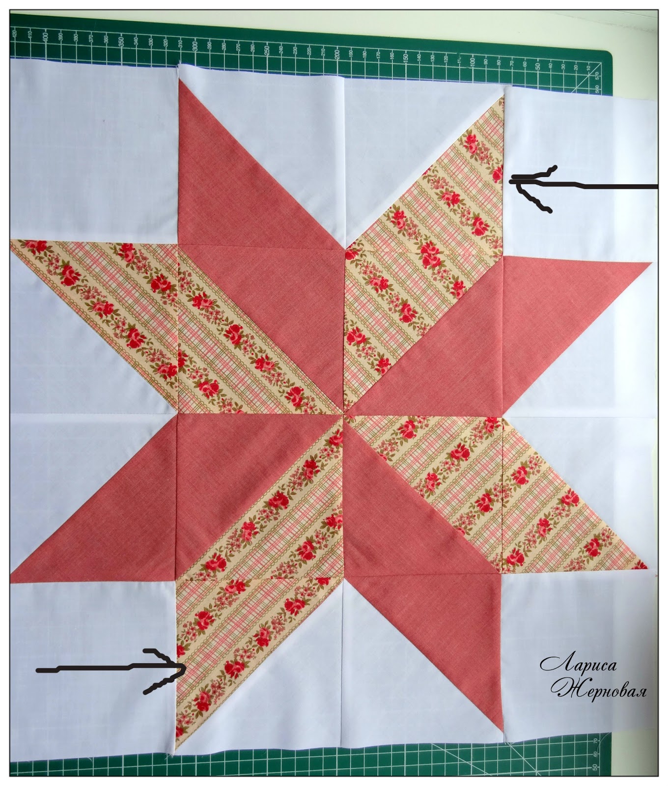 Выкладываем звезду, причем те квадраты, у которых припуски на белую сторону выкладываем вверху и внизу звезды, там где стрелочки.