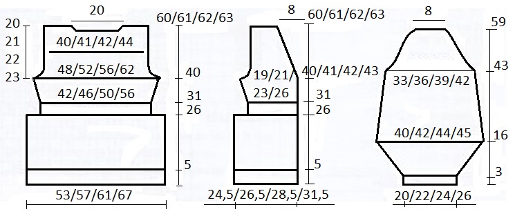 На высоте 59 / 60 / 61 / 62 см от начального ряда, для оформления линии горловины, закрыть средние 14 петель. В следующем лицевом ряду, для закругления горловины, закрыть с внутреннего края вязания еще по 13 петель. Закрыть оставшиеся петли плеч.