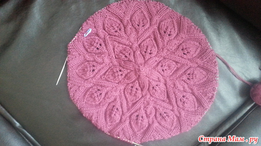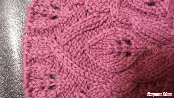 Закончив вязание по схемам, у меня получился ободок немного большеватый и я в каждом листочке убавила по три петли. Резинку вязала косами 1х1.