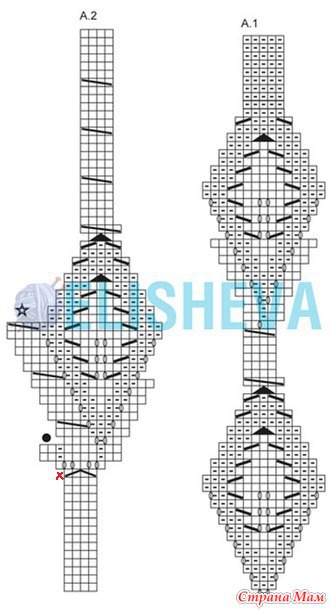 Дойдя до ряда обозначенного на схеме красным крестиком, значек "^" вяжем так снимаем на дополнительную спицу две петли перед работой и провязываем петлю лицевой и скрещенной лицевой и вторую петлю также, а потом провязываем петли с дополнительной спицы лицевой