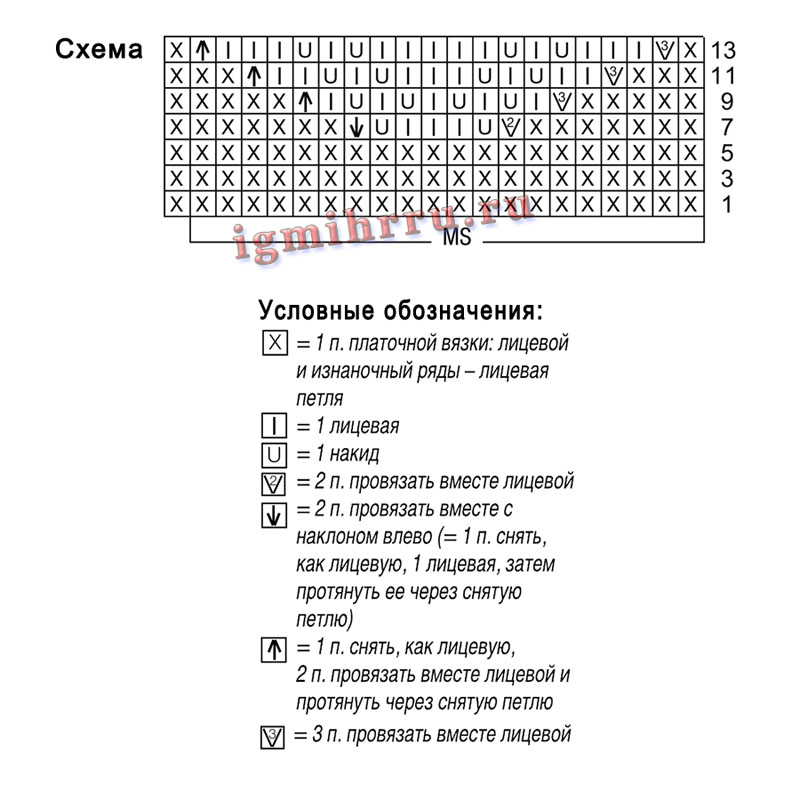 Ажурный узор: число петель кратно 20 + 1 + 2 кромочные. Вязать по схеме, на которой даны лицевые ряды. В изнаночных рядах петли провязывать по рисунку или согласно инструкции, накиды провязывать изнаночными. Начать с 1 кромочной, раппорт постоянно повторять, закончить петлей после раппорта и 1 кромочной. Постоянно повторять 1–14-й ряды.