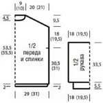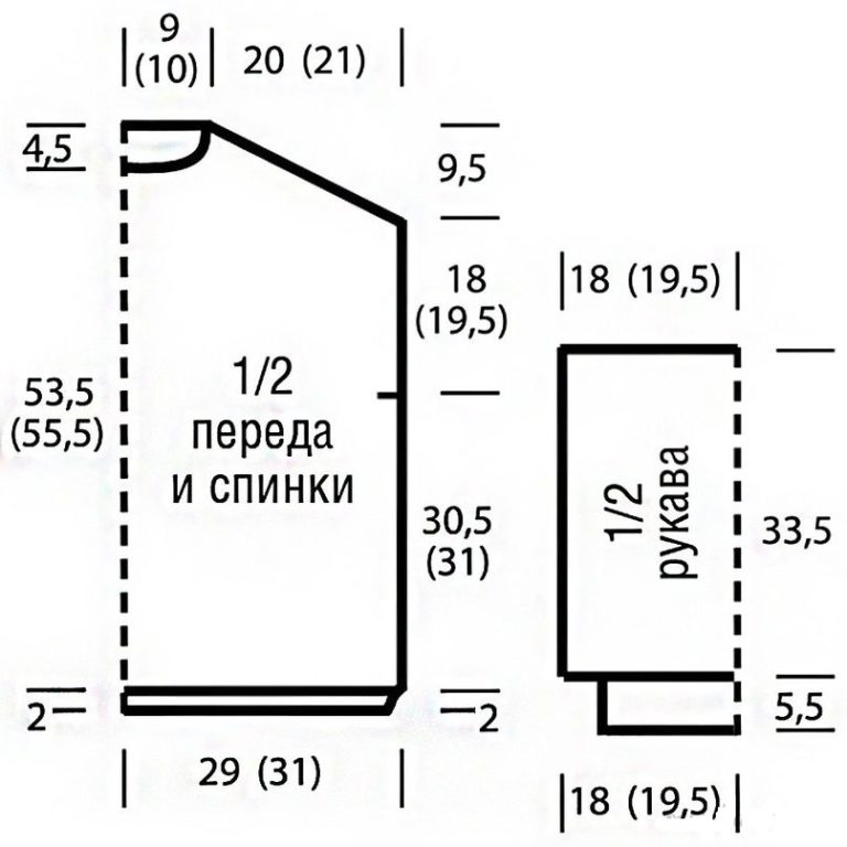 вязать, как спинку, но через 55,5(57,5) см закрыть для горловины средние 23 п. и обе стороны закончить раздельно. Для скругления по внутреннему краю закрыть в каждом 2-м ряду 1 х 4 п., 1 х 3 п., 2 х 2 п. и 4 х 1 п. На высоте спинки закрыть оставшиеся по 17 (24) п. плеч.