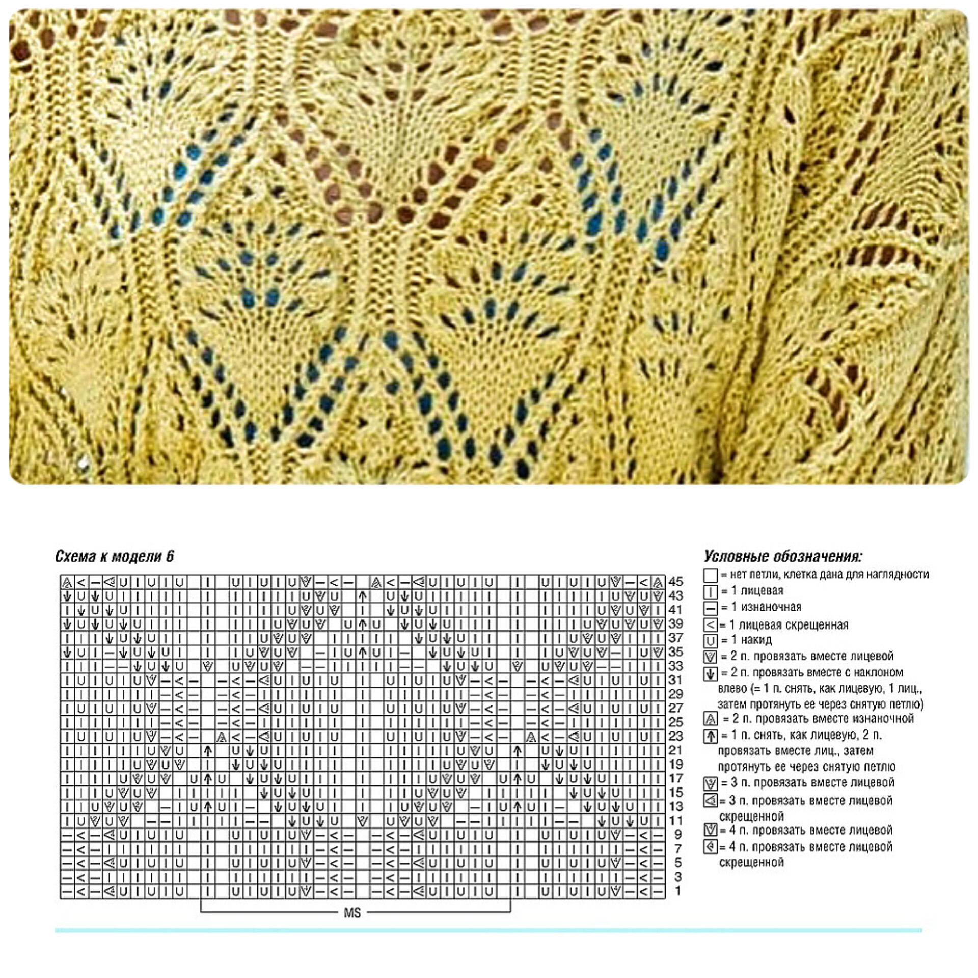 Узор 2 (спицы № 4,5): ажурный узор (в начале вязания число петель кратно 19 + 2 кромочные) – вязать по схеме. На ней приведены только лицевые ряды. В изнаночных рядах все петли провязывать по рисунку, накиды провязывать изнаночными, лицевые скрещенные – изнаночными скрещенными.