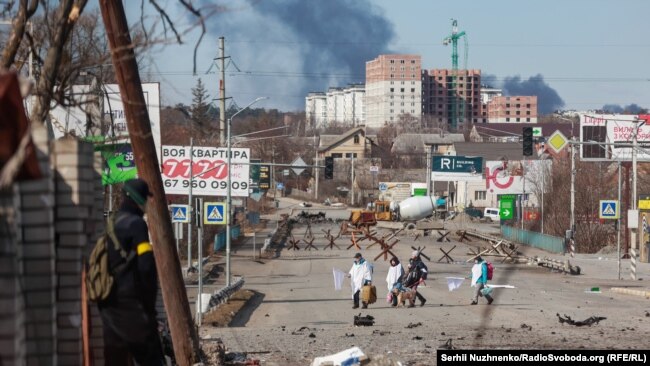 ФОТОГАЛЕРЕЯ: Раніше 7 березня Міноборони Росії заявило про намір з 9:00 припинити вогонь, щоб забезпечити гуманітарні коридори і дозволити евакуацію цивільного населення, але влада України це поки не підтверджувала. Ірпінь, Київщина. 7 березня 2022 року