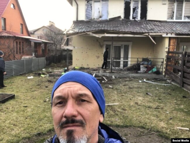Роман Власенко на тлі свого обстріляного російськими військовими будинку у Ворзелі