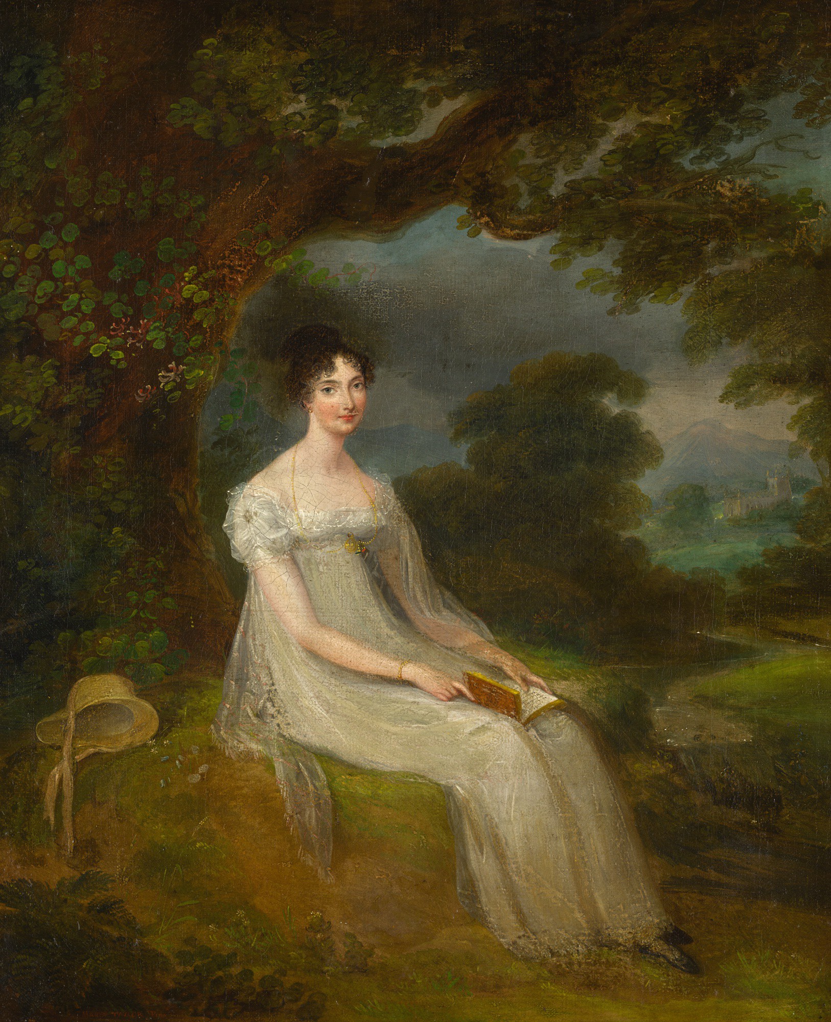 PORTRAIT OF A LADY IN A WHITE DRESS, FULL-LENGTH, READING IN A LANDSCAPE