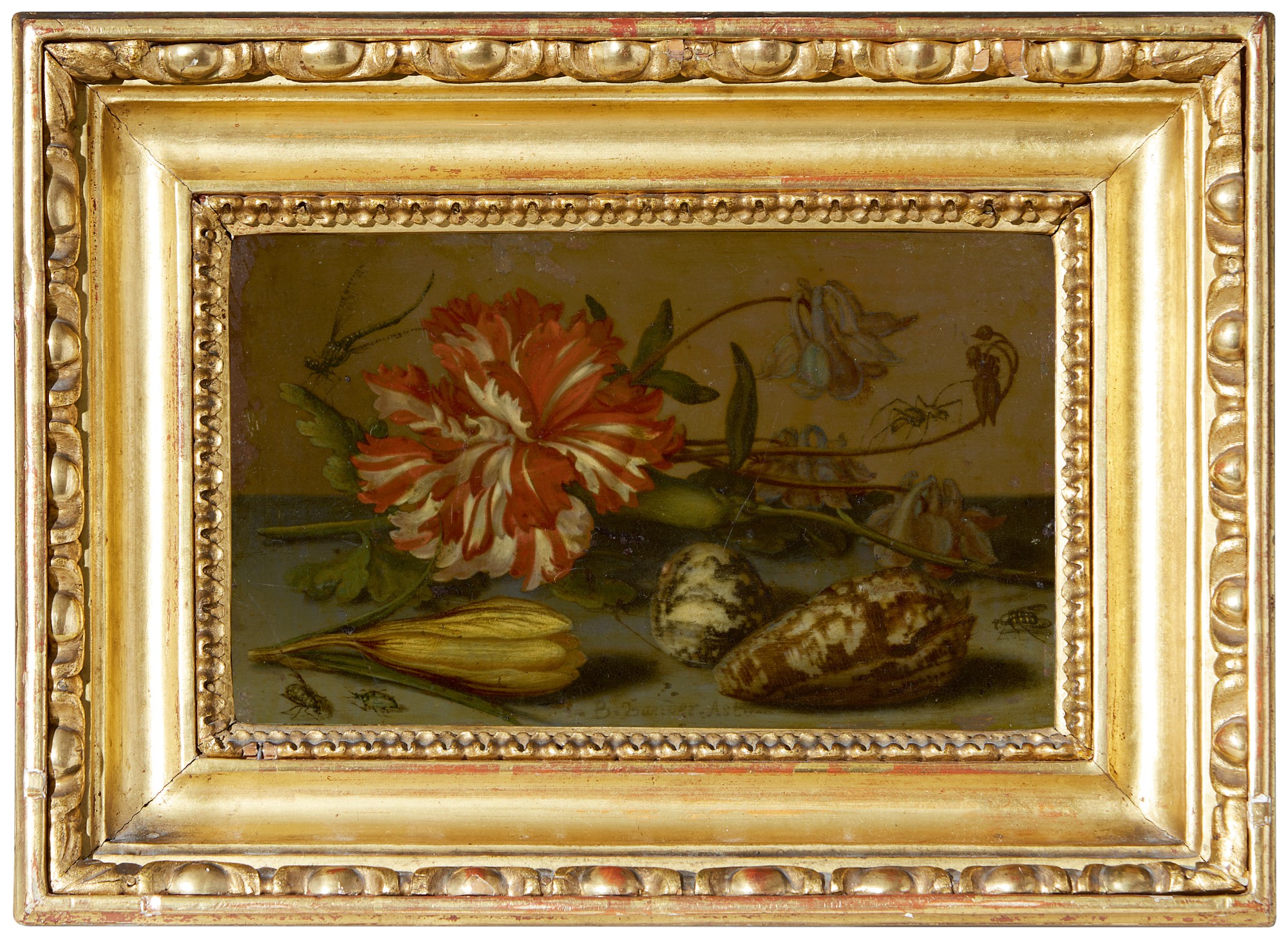 STILL LIFE WITH A CARNATION AND A CROCUS, TWO SHELLS, AND A DRAGONFLY, SPIDER AND FLIES, ALL ON A STONE LEDGE