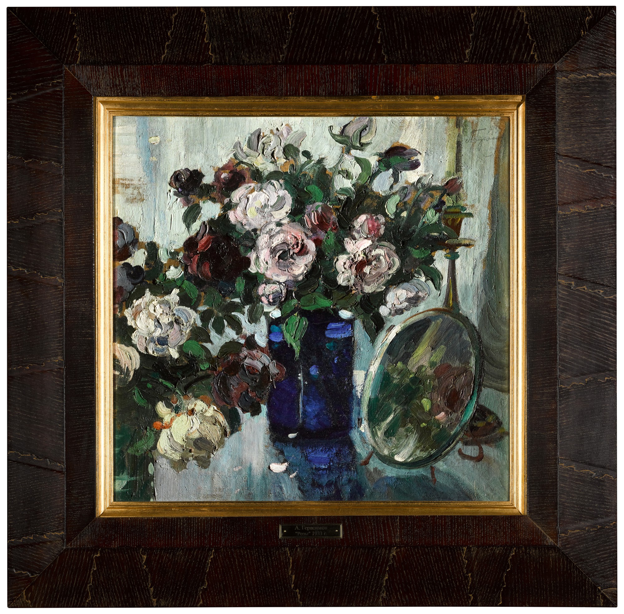 A STILL LIFE OF ROSES AND OTHER FLOWERS IN A BLUE VASE WITH A BOOK