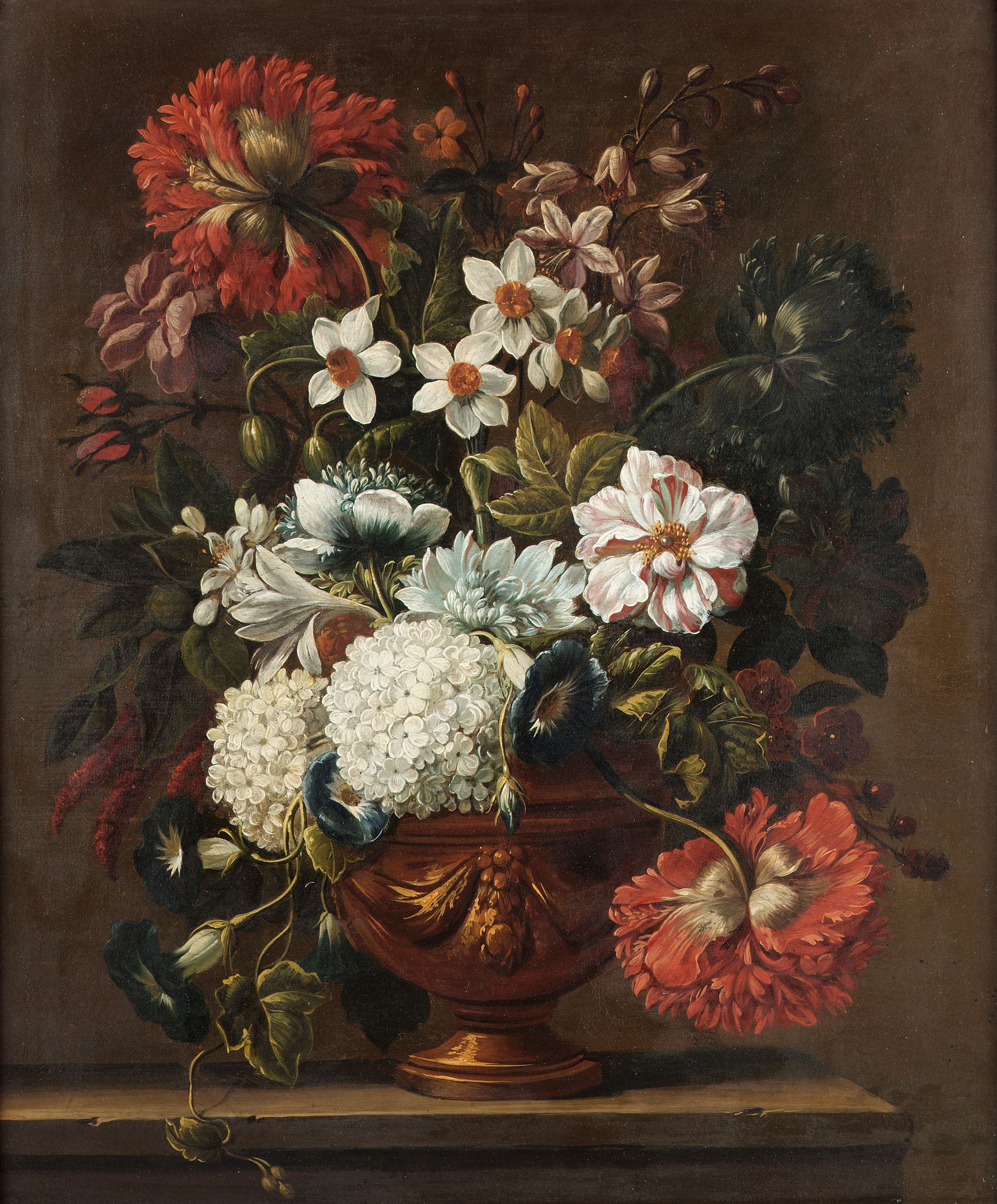 Chrysanthemums, narcissi, snowballs, morning glory and other flowers in a bronze urn