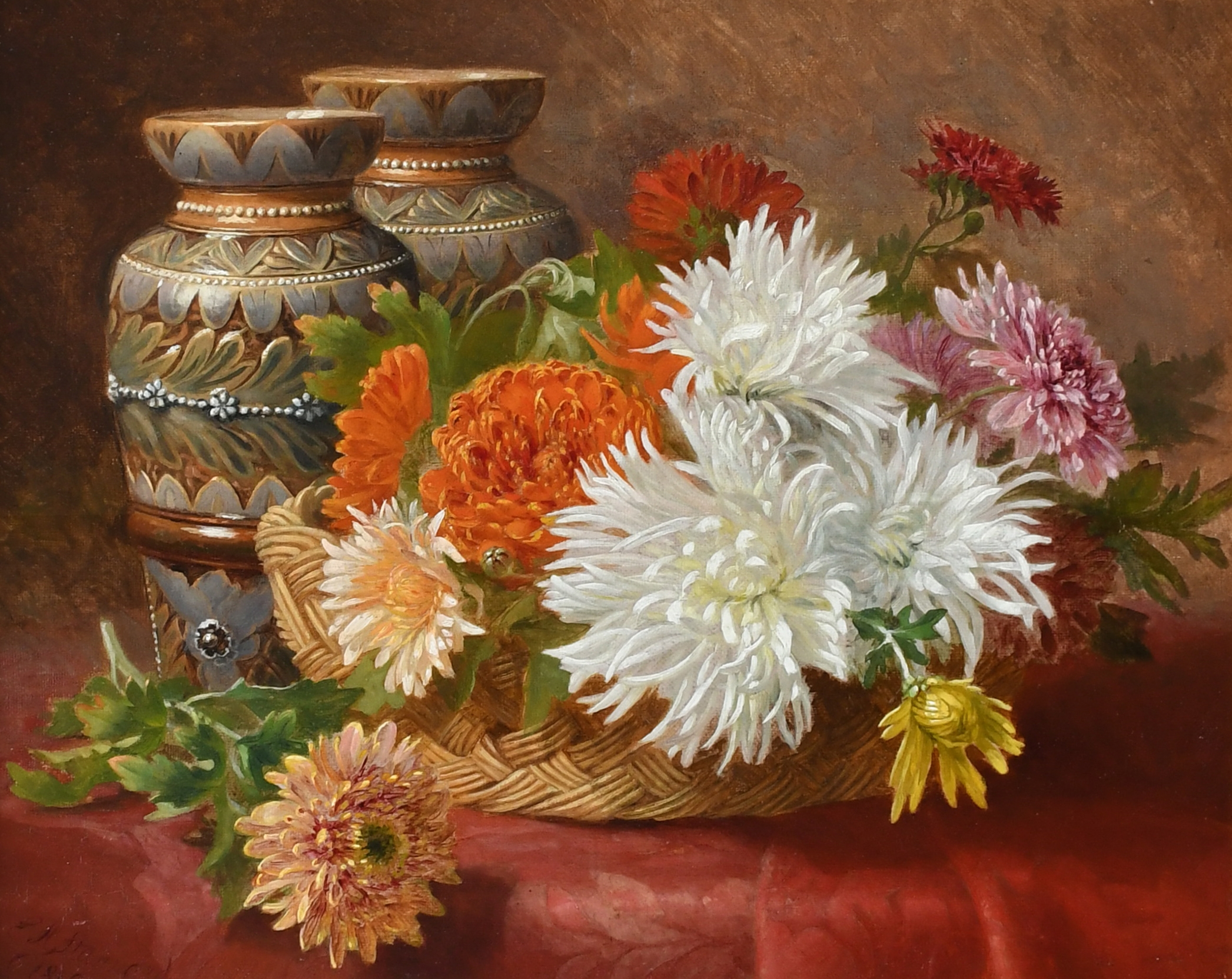 Still life with flowers in a basket and two Doulton