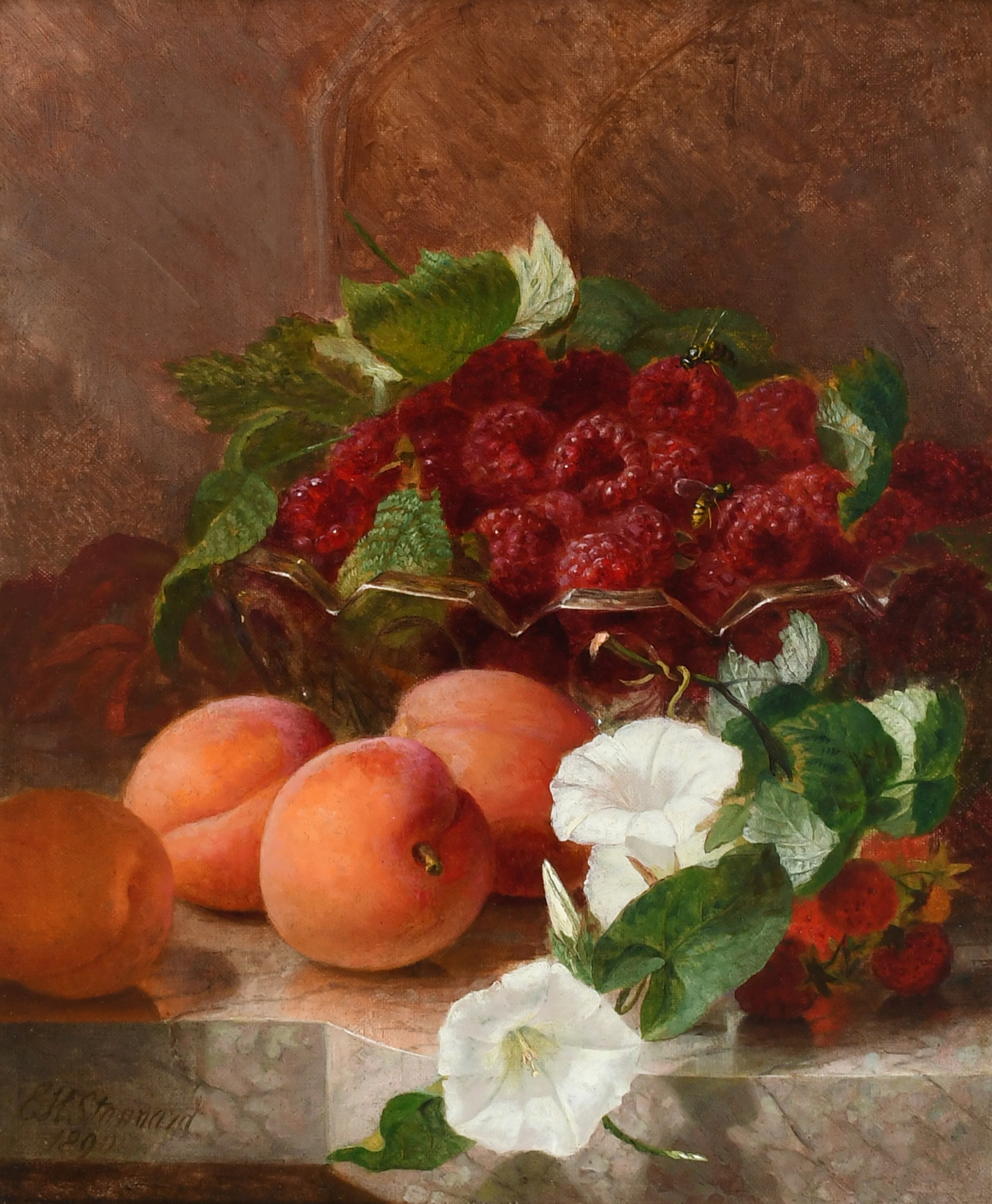 Still life with raspberries, peaches and convolvulus