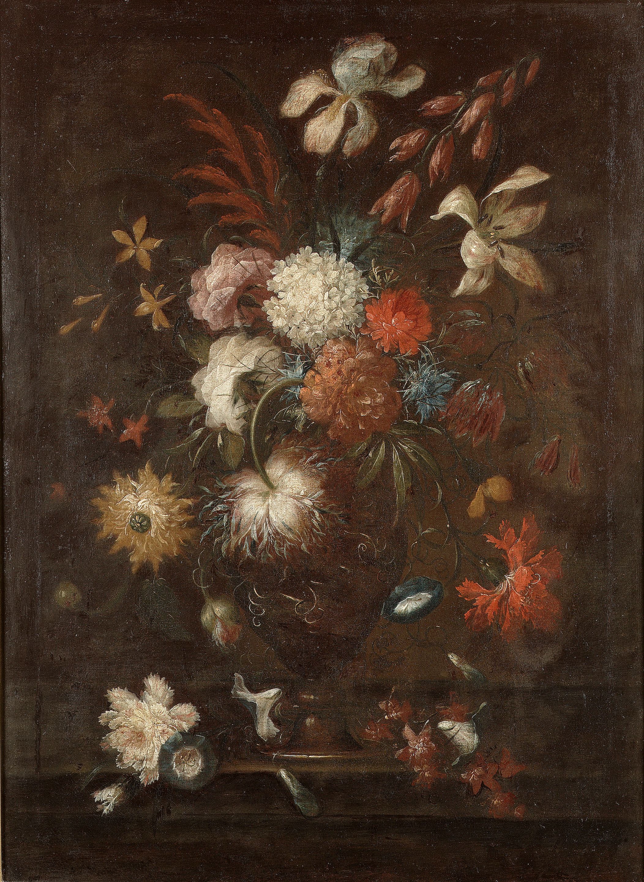 Irises, morning glory, a snowball and carnations in a bronze urn on a ledge