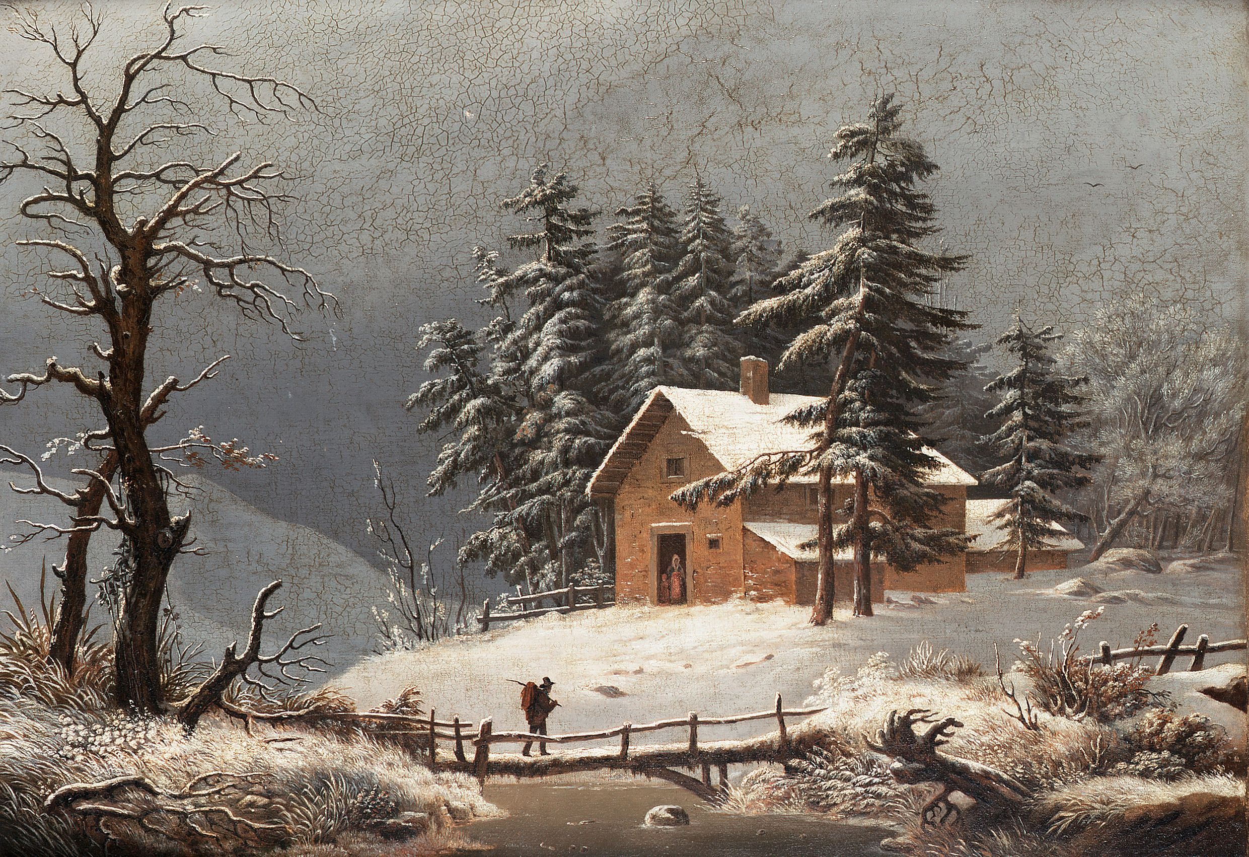 An Alpine landscape with a snow covered chalet and a figure crossing a bridge