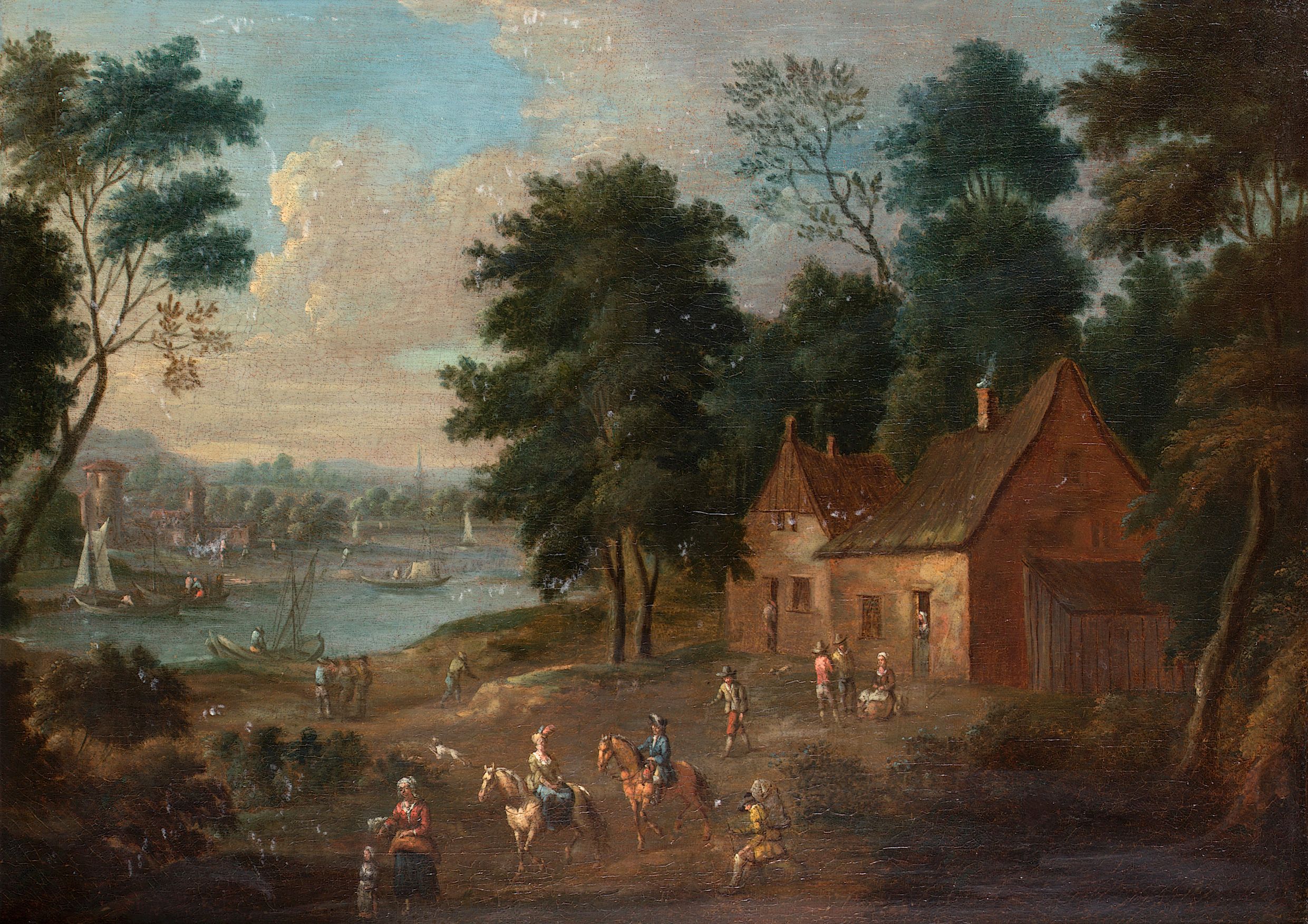 Riders outside a country cottage, a river landscape beyond