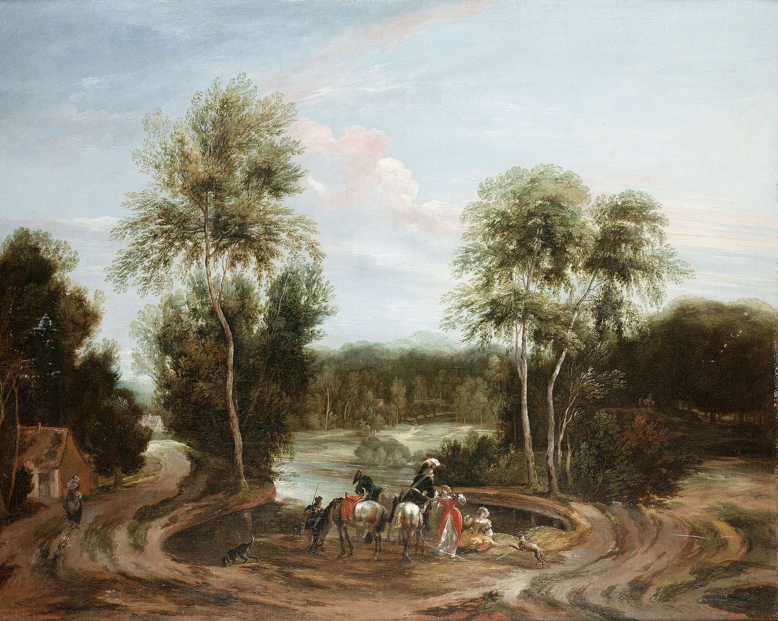 A wooded landscape with an elegant company resting beside a lake