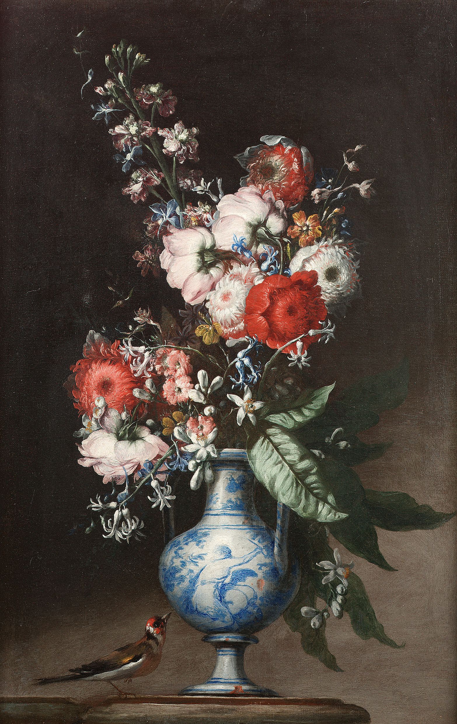 Chrysanthemums, roses, bluebells and other flowers in a blue and white vase on a stone ledge with a greenfinch nearby