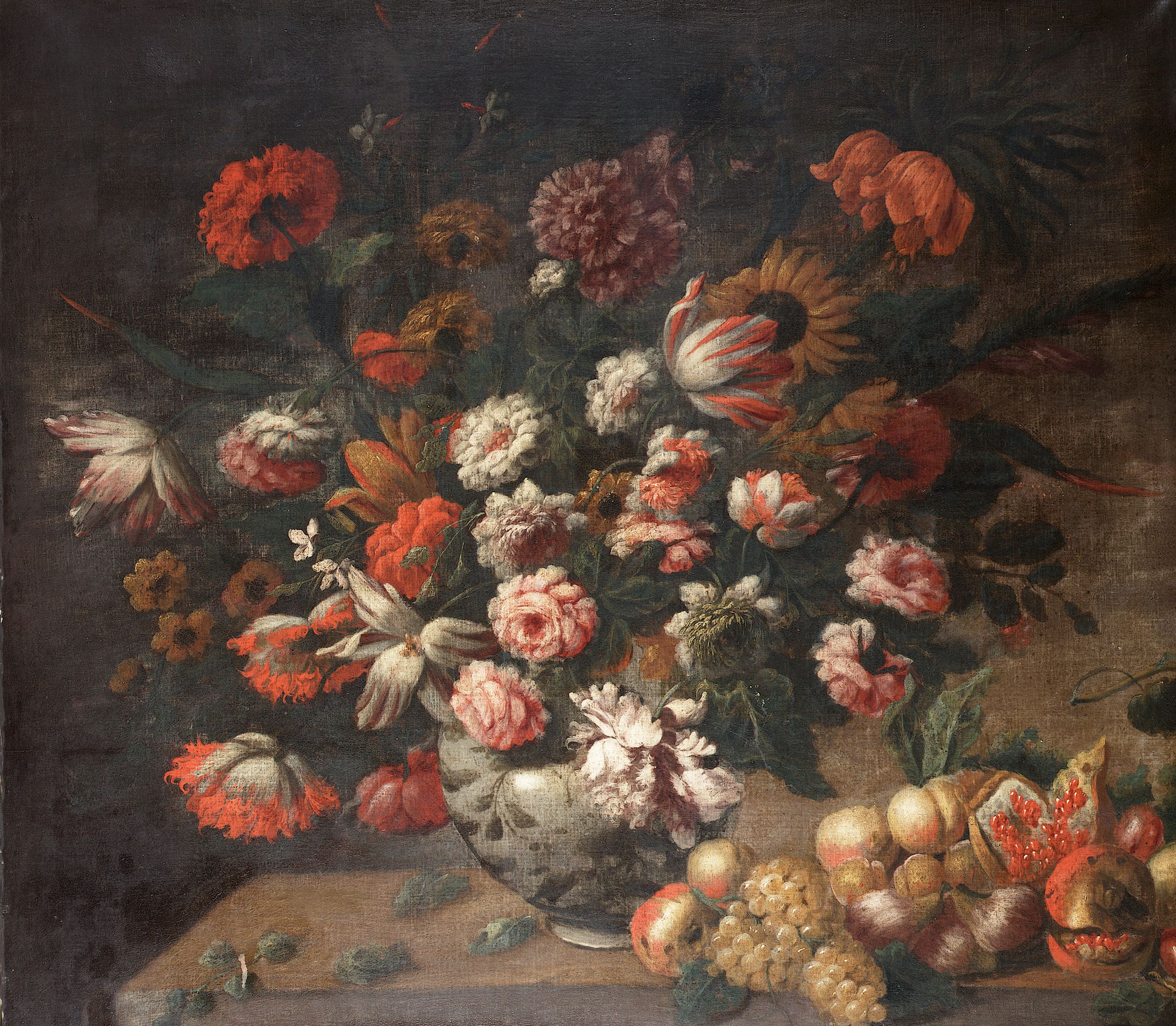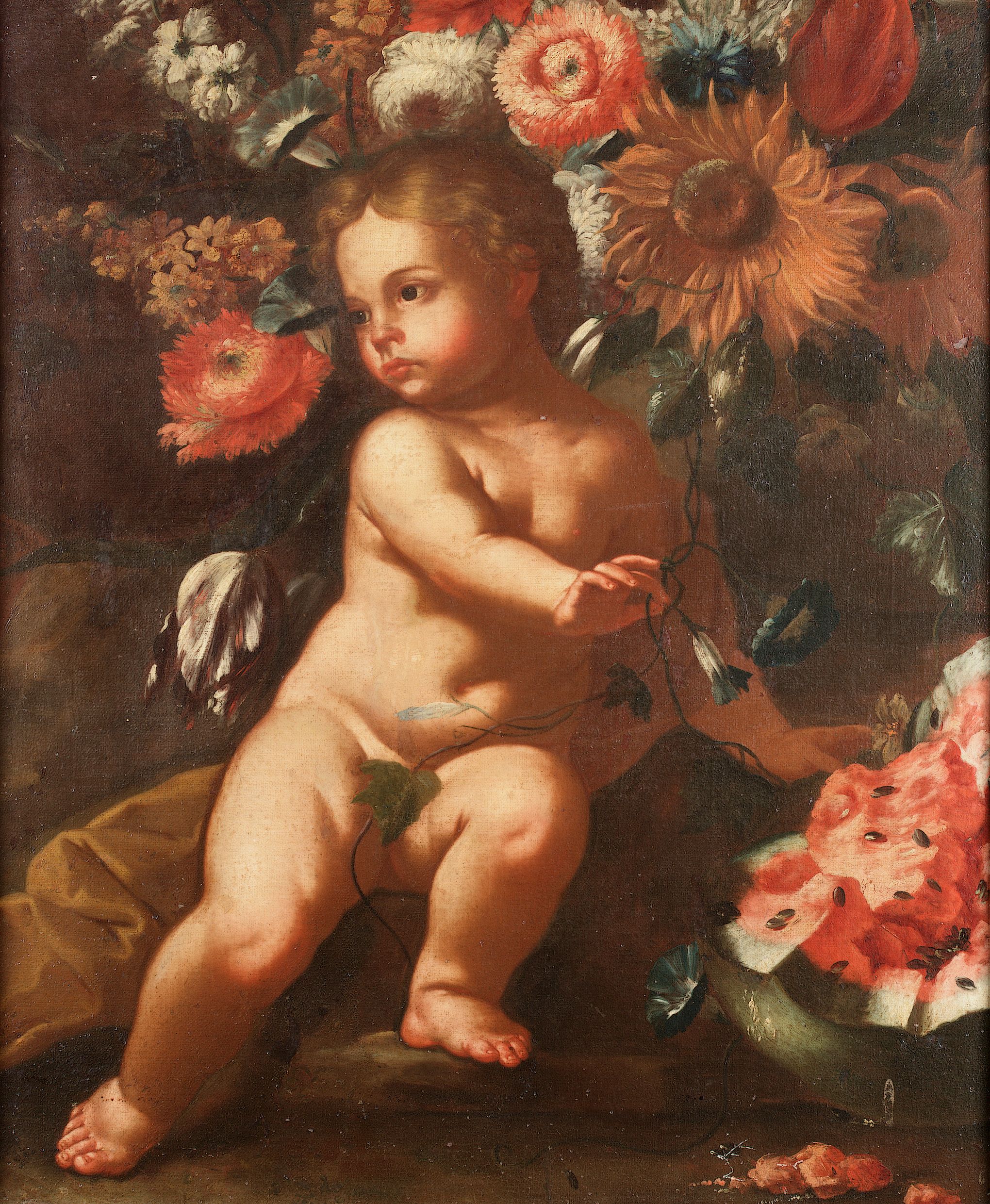 A putto beside a watermelon, beneath a sunflower, convolvulus, tulips and other flowers, a fragment