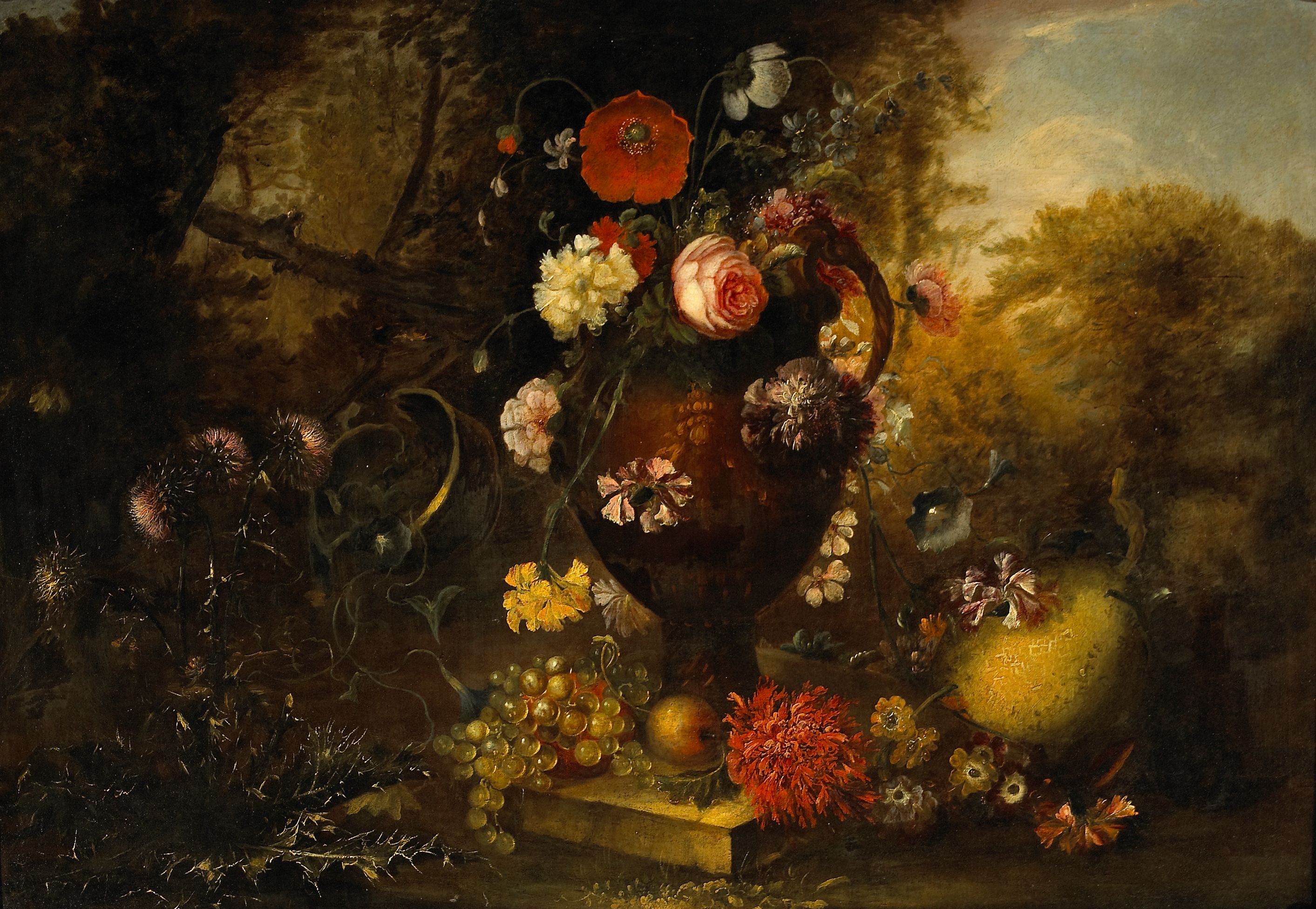 A still life with fruit and flowers in a vase bears signature and inscription