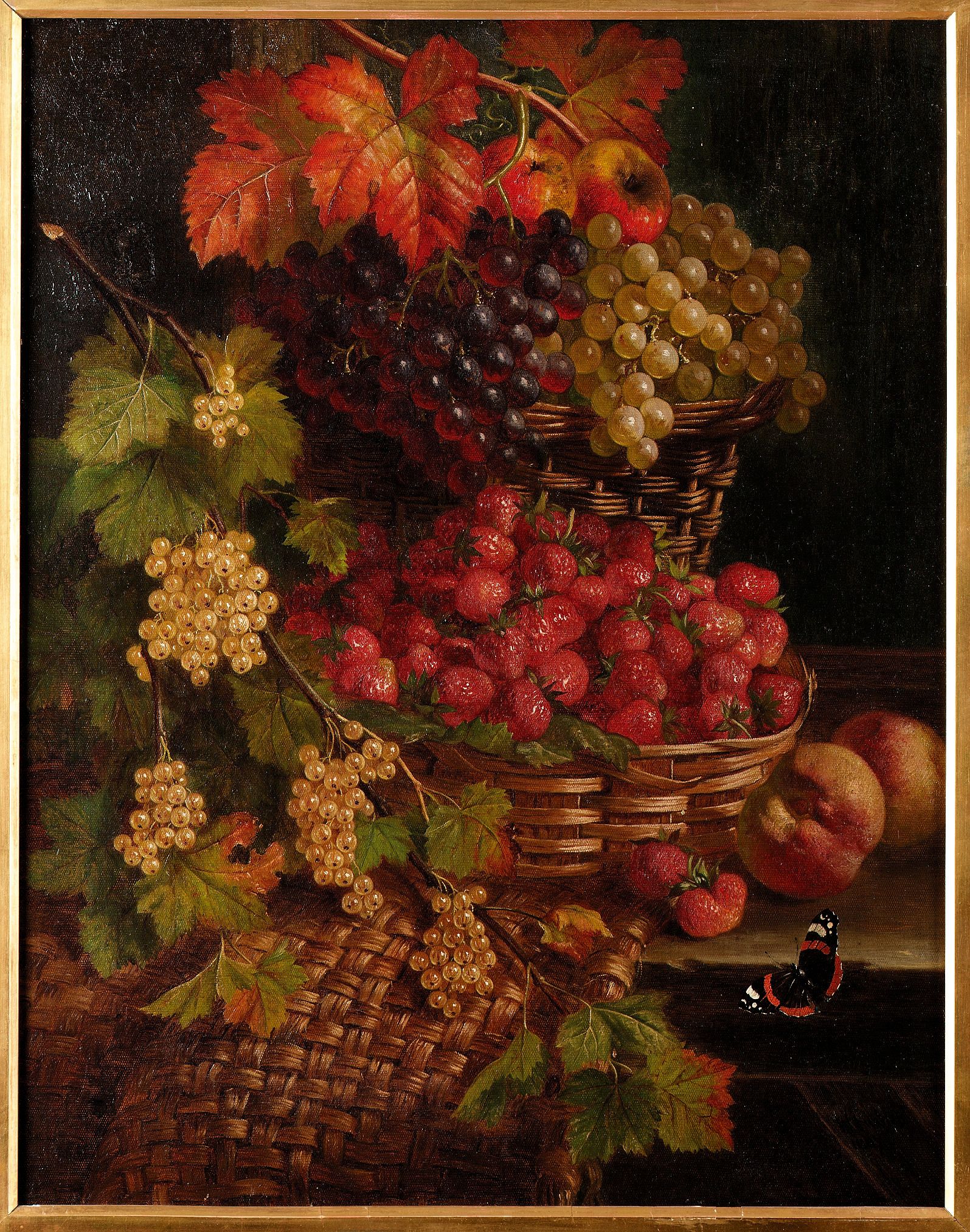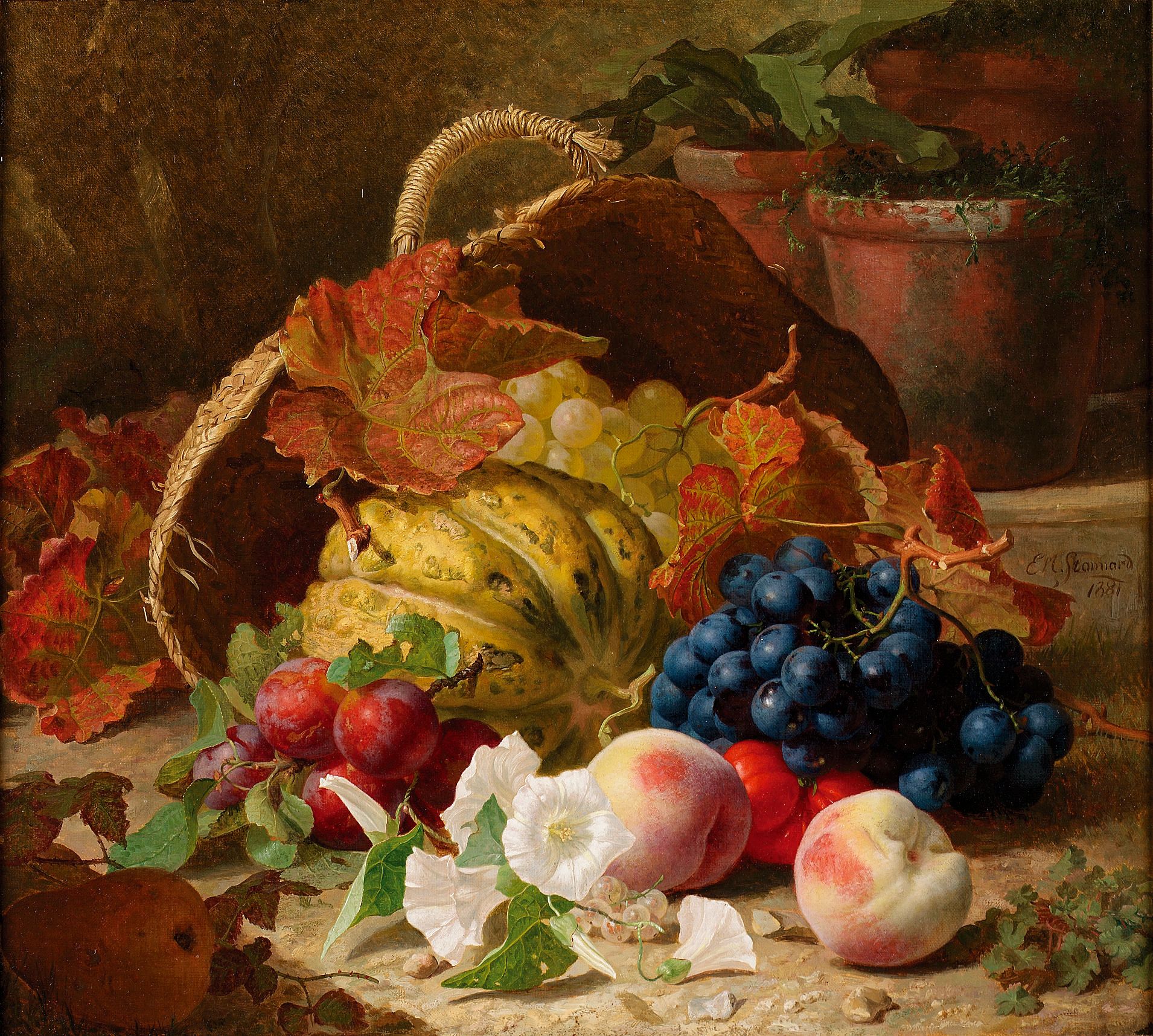 A cut melon, cherries, gooseberries, peaches, grapes, figs, plums, flowers, snails and insects on a stone ledge