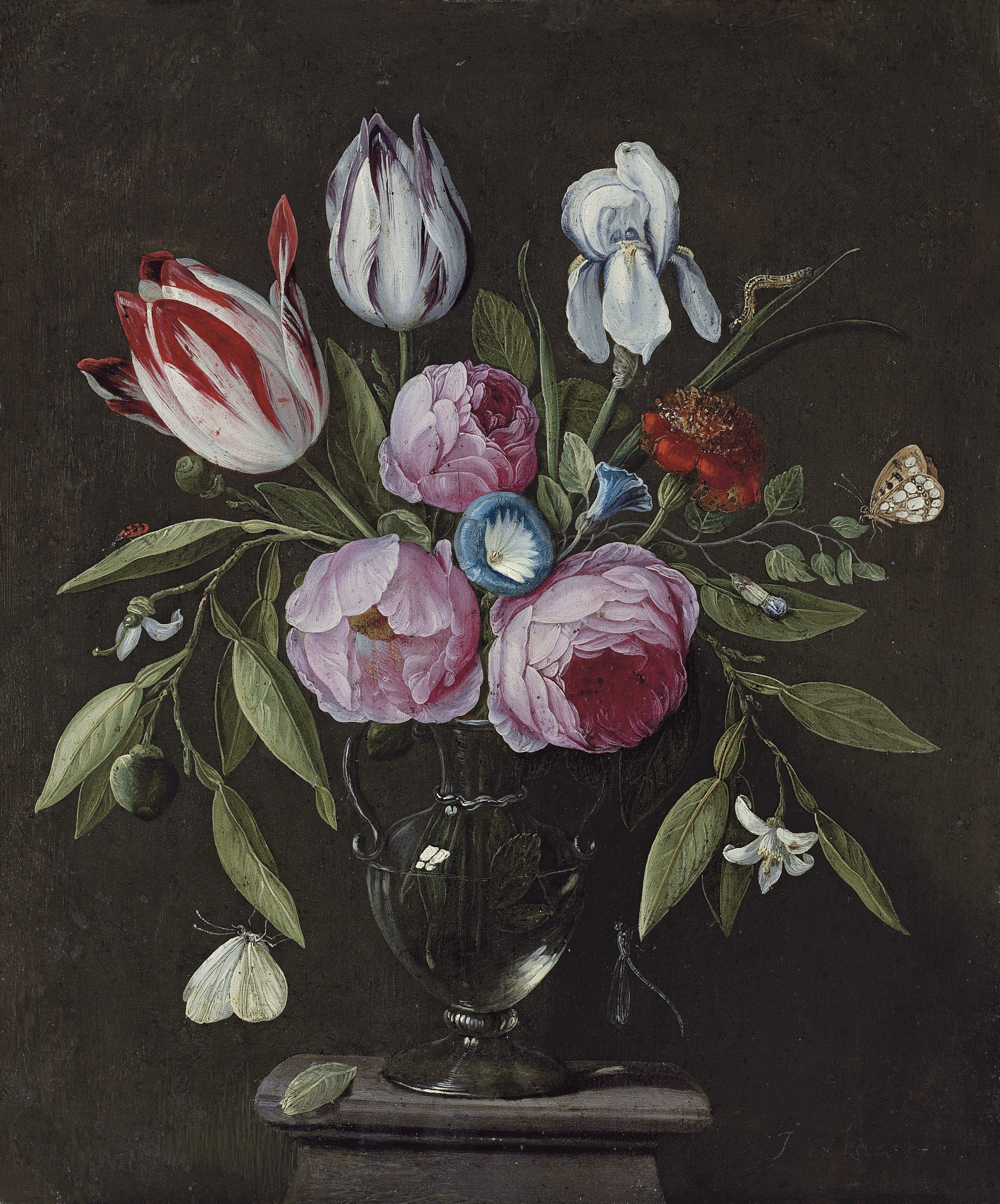 Roses, tulips, an iris and other flowers, in a glass vase on a stone plinth, with butterflies and other insects