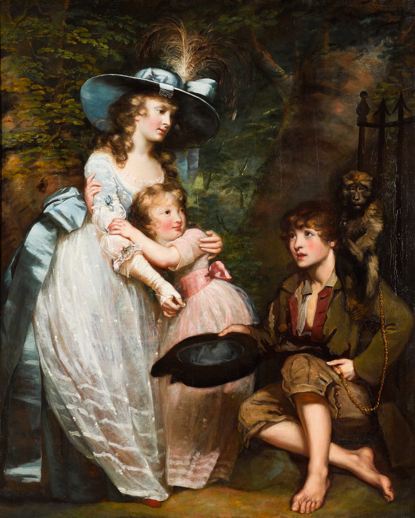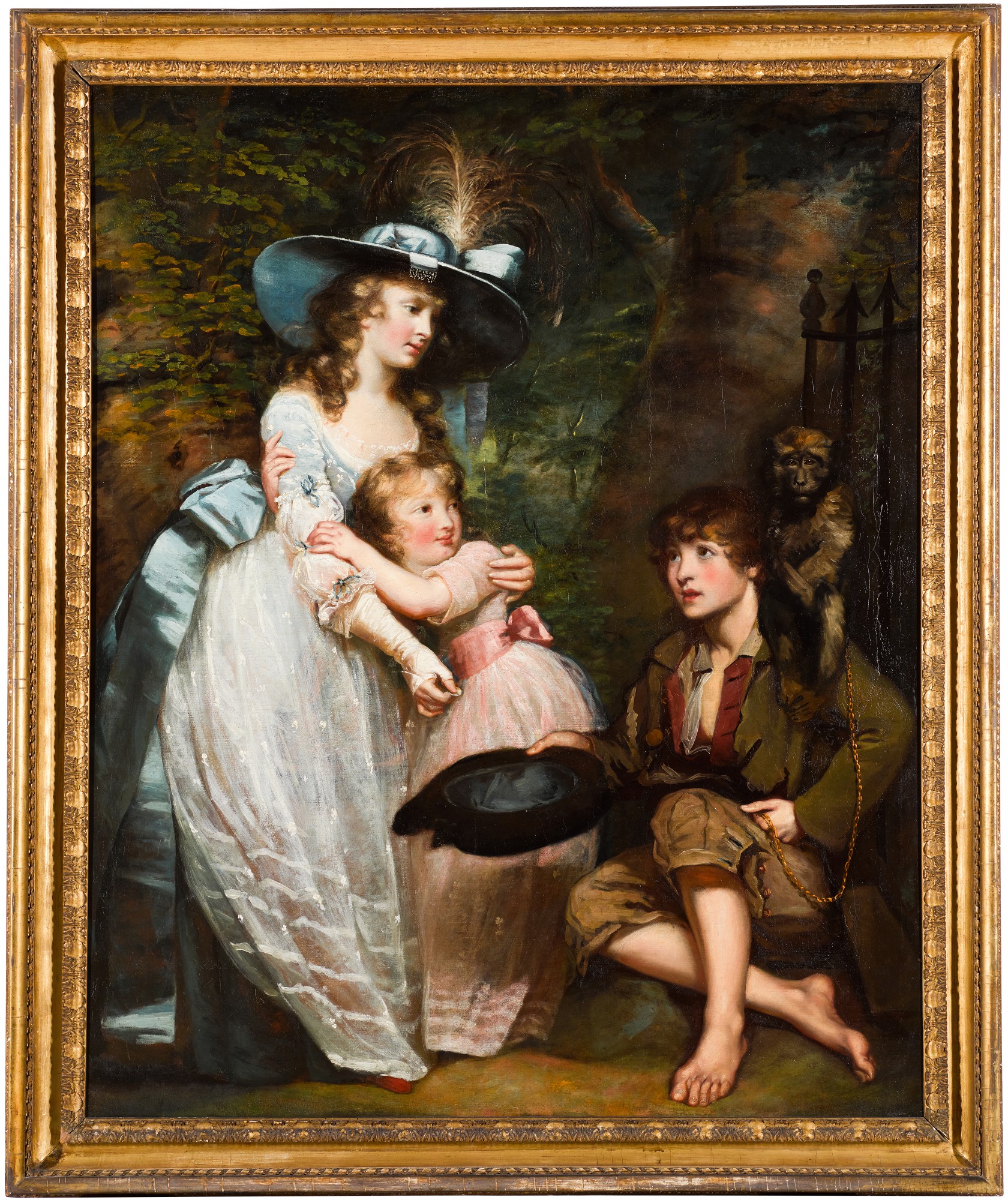 A YOUNG WOMAN AND GIRL OFFERING CHARITY TO A KNEELING BEGGAR BOY WITH A MONKEY ON HIS SHOULDER