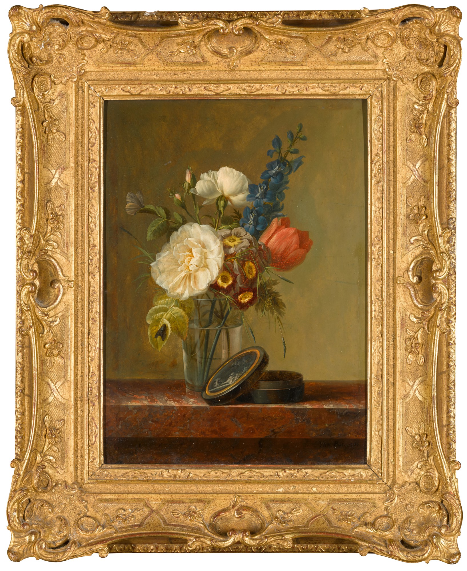 STILL LIFE OF A ROSE, A TULIP, AND OTHER FLOWERS, WITH A PAINTED BOX, ALL ON A MARBLE LEDGE