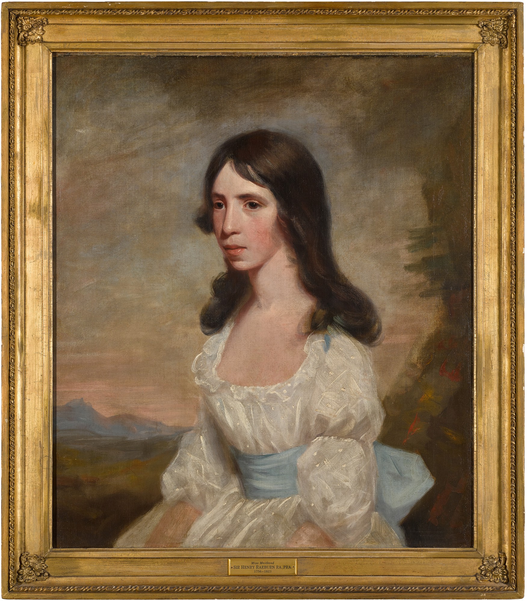 PORTRAIT OF MISS MAITLAND, HALF-LENGTH, SEATED IN A LANDSCAPE, WEARING A WHITE DRESS WITH A BLUE SASH