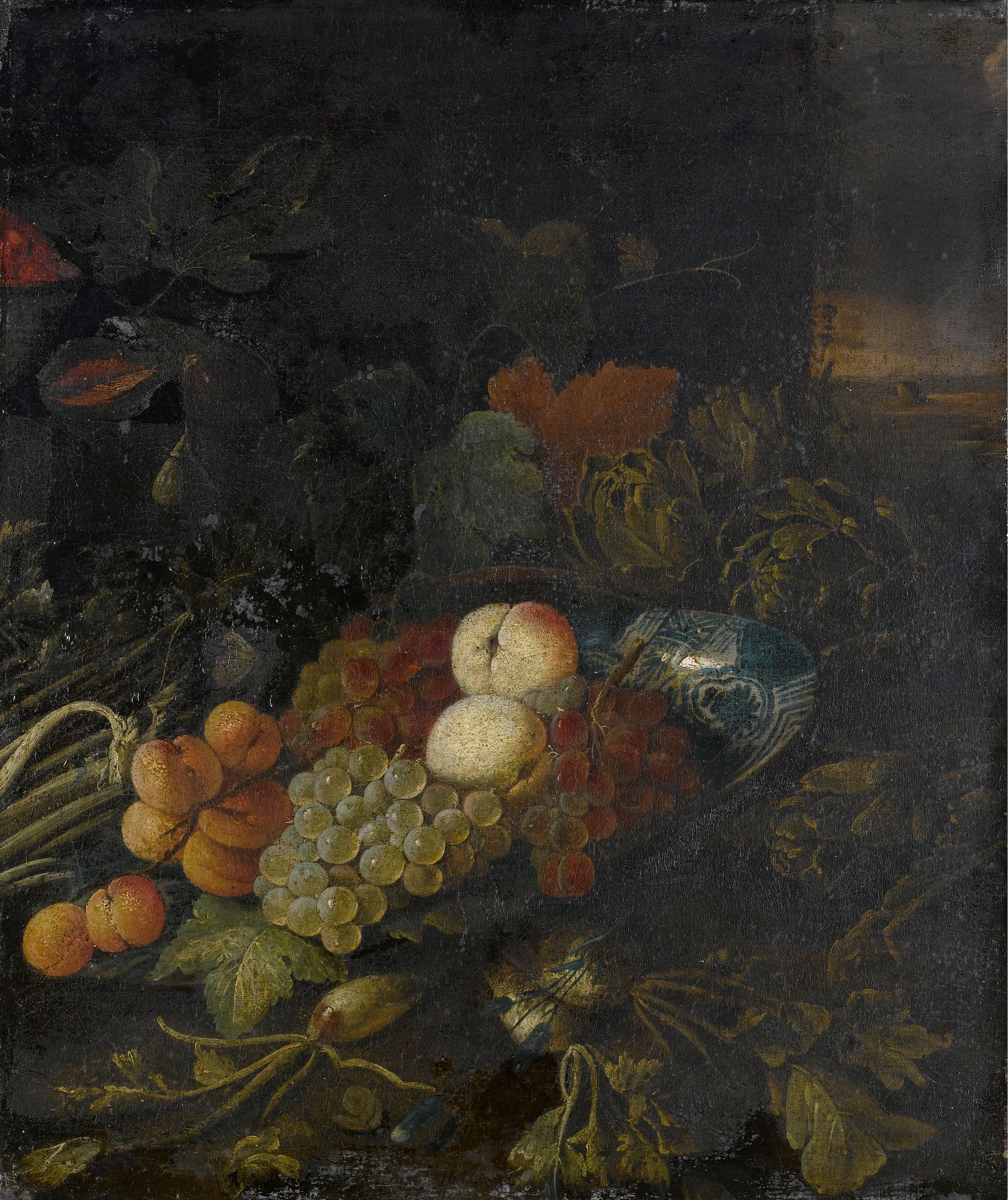 A dish with peaches, grapes and apricots, with artichokes, asparagus and figs on a table-top
