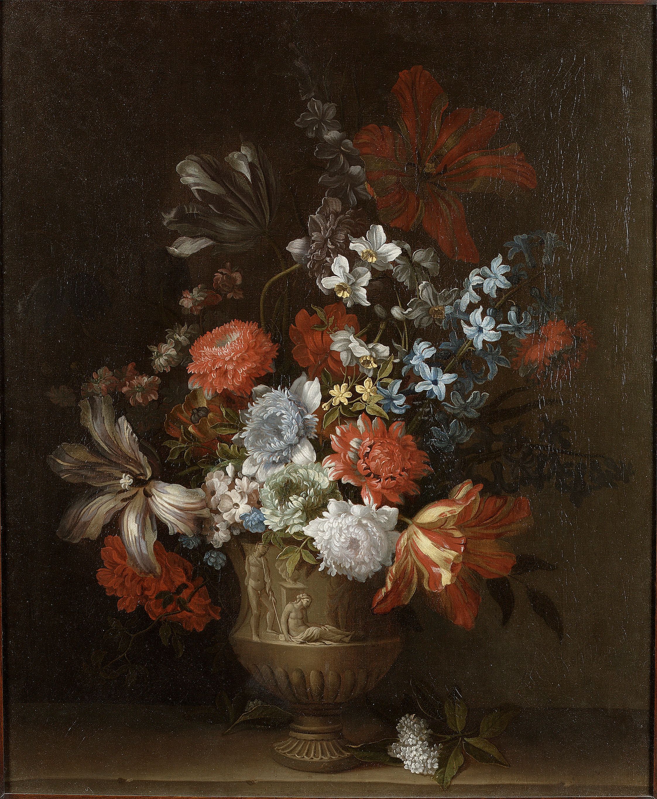 Tulips, carnations, narcissi and other flowers in a stone urn on a ledge