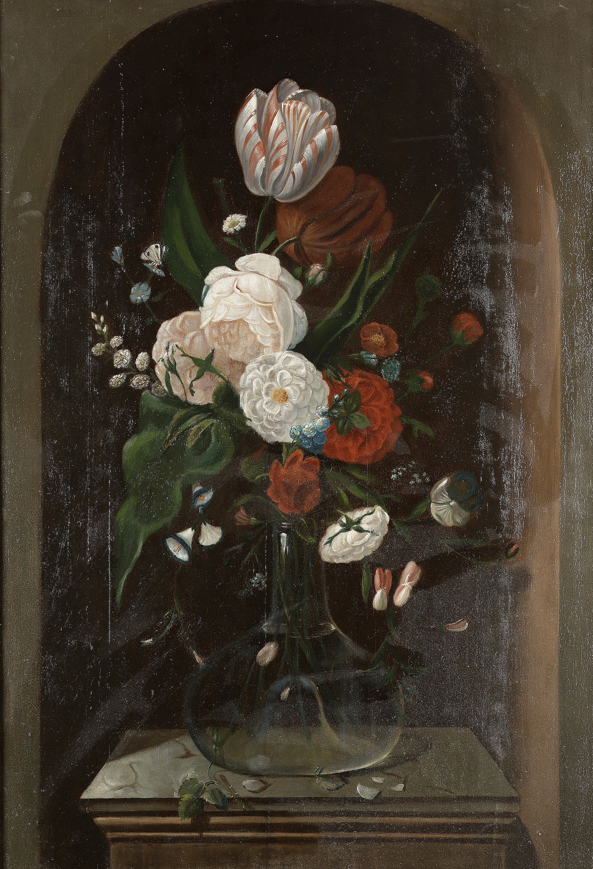 A tulip, roses, chrysanthemums, morning glory and other flowers in a glass vase on a plinth