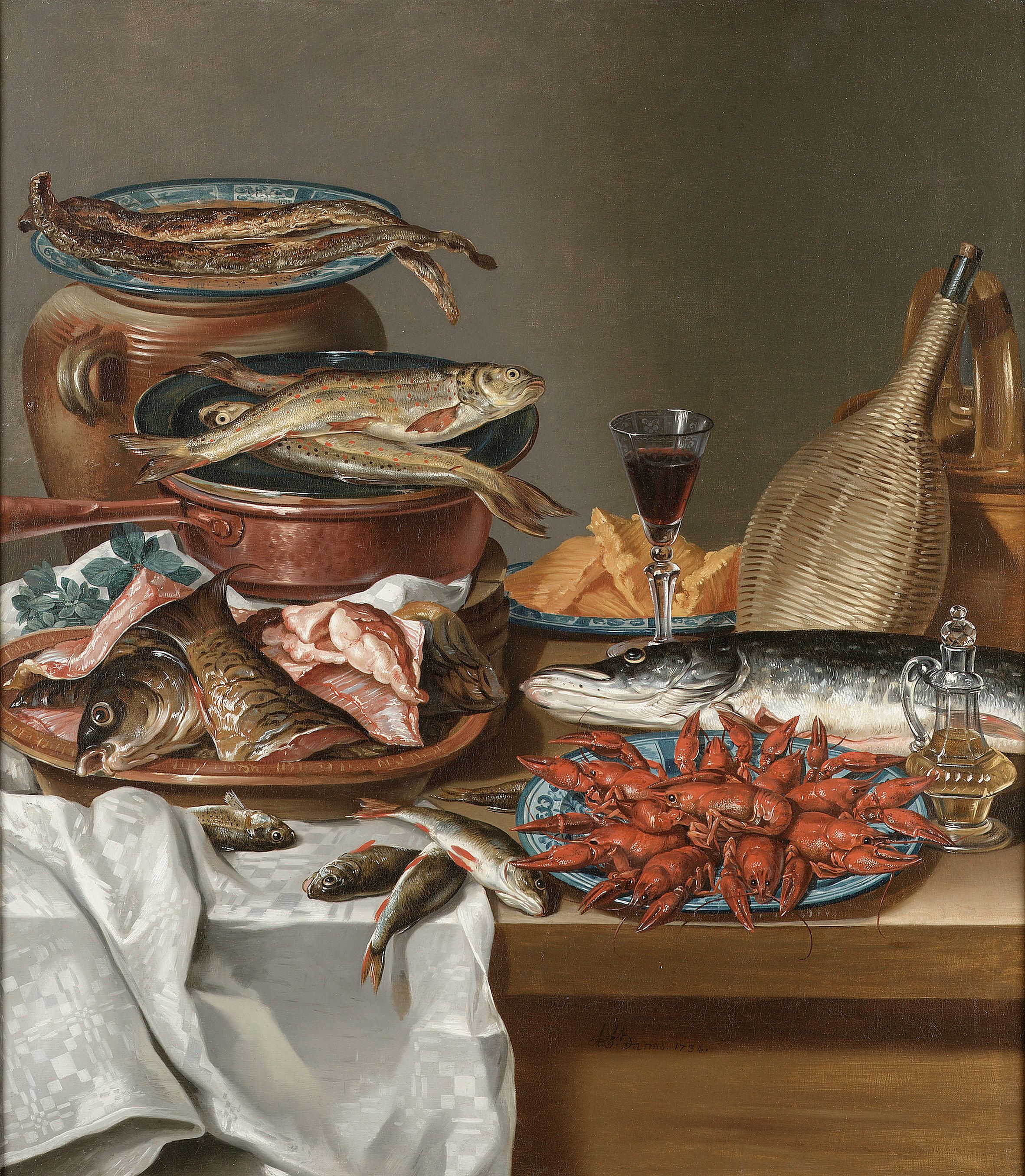 A still life of a plate of herrings on an urn, trout on a copper saucepan, a dish of filleted fish, a bottle and a glass of wine, a salmon, baby lobsters on a plate