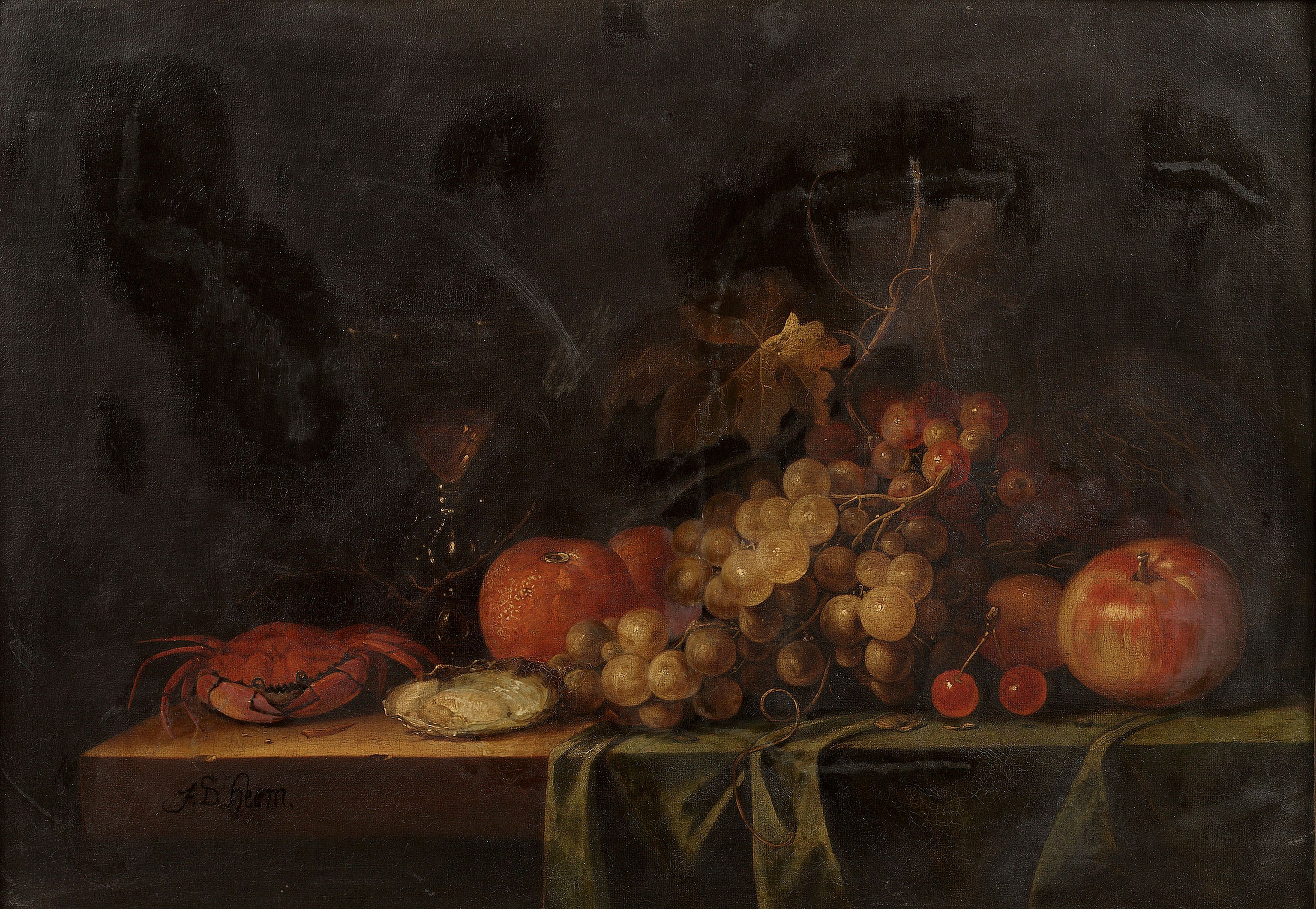 An oyster, cherries, oranges, an apple and a glass of wine on a partially draped table bears