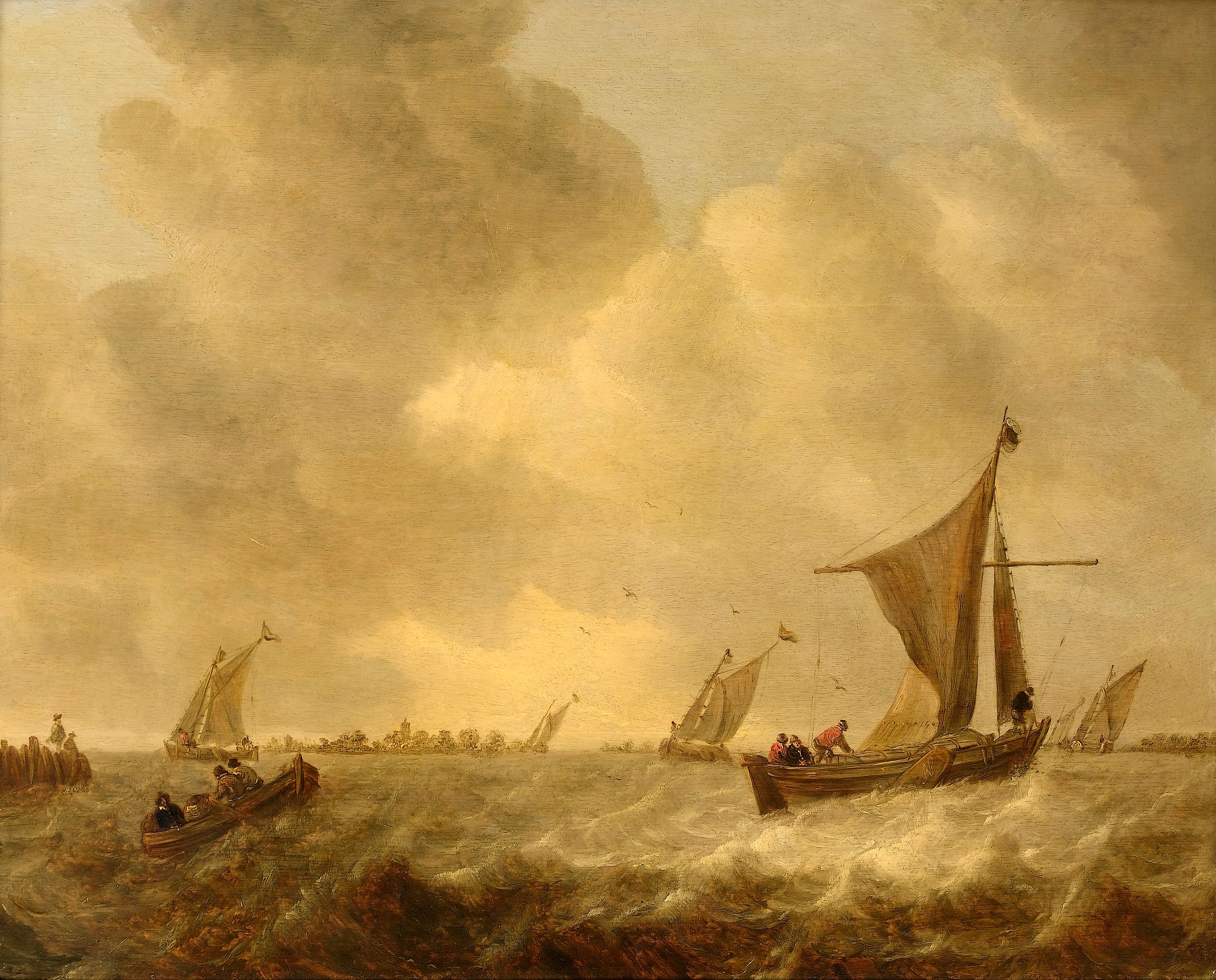 Figures in a rowing boat in choppy waters with Dutch pinks