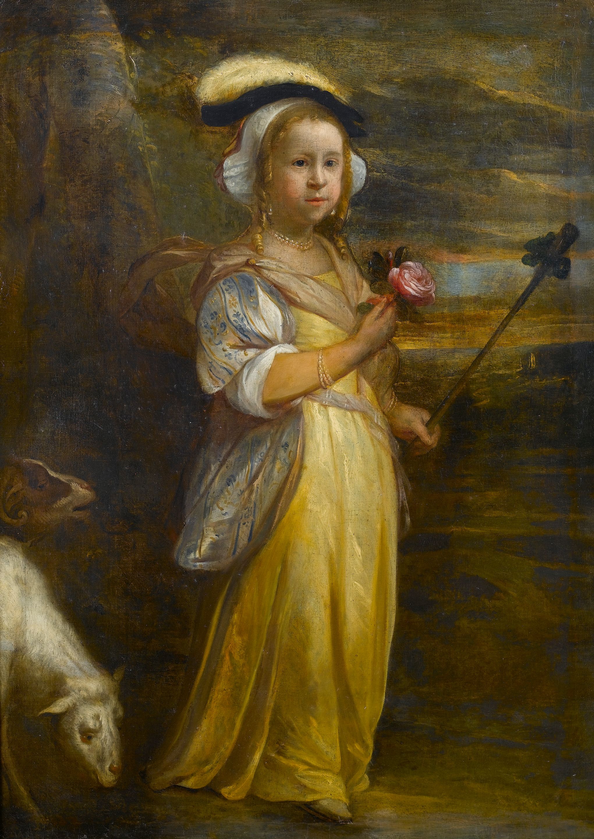 Portrait of a young girl dressed as a shepherdess, in a yellow dress