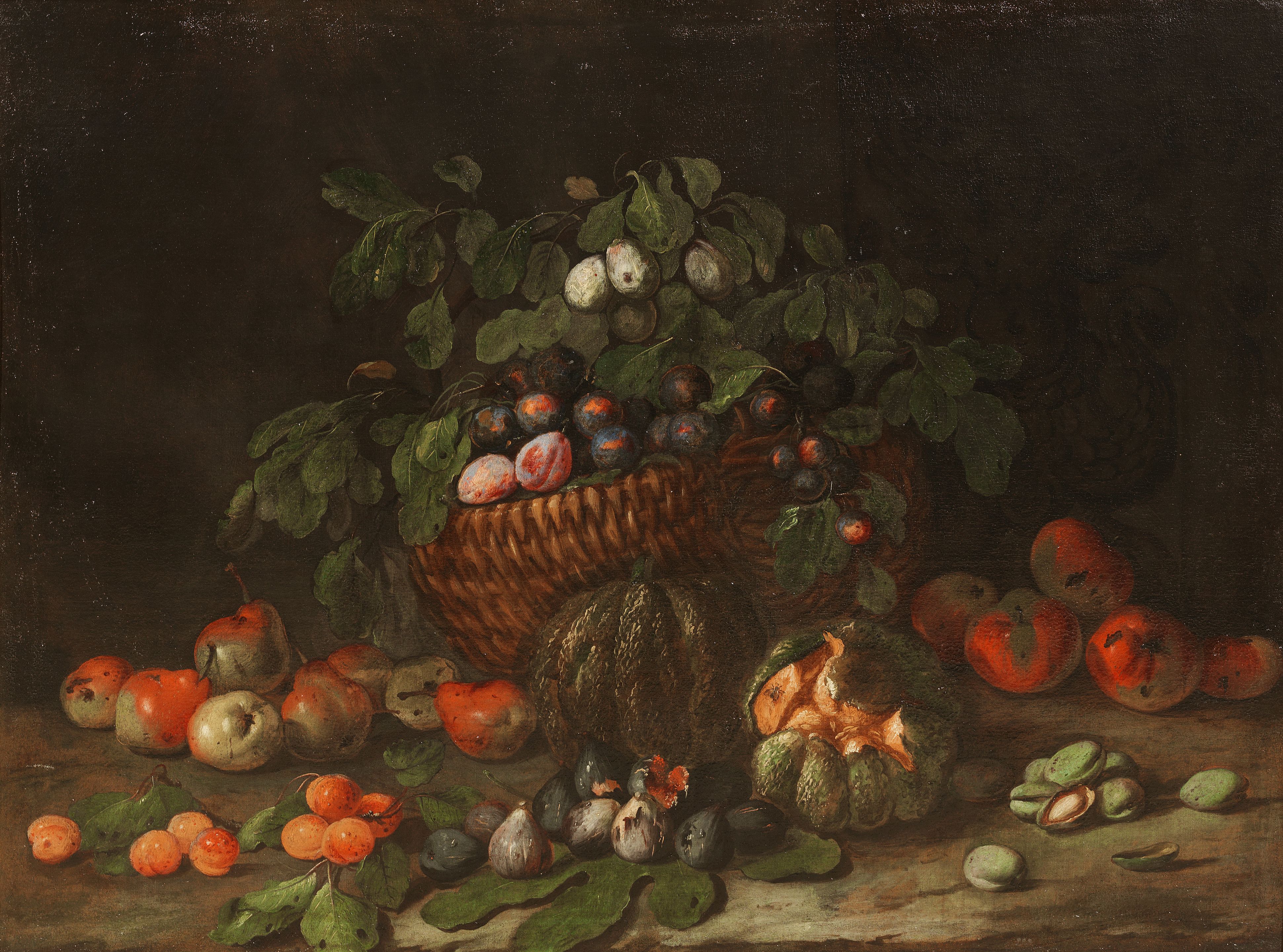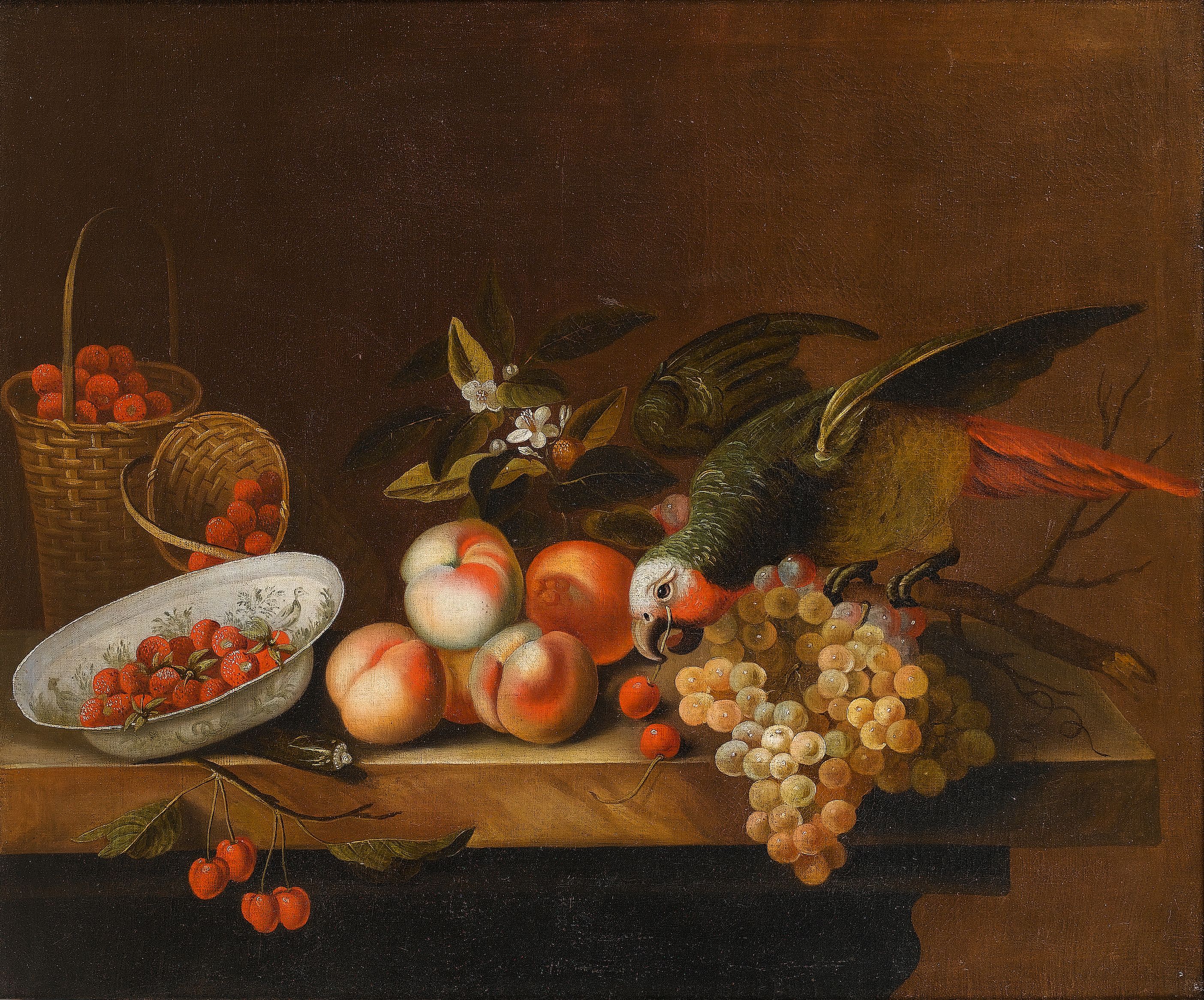 Baskets and a wan-li kraak dish of strawberries with peaches, grapes and orange blossom on a table