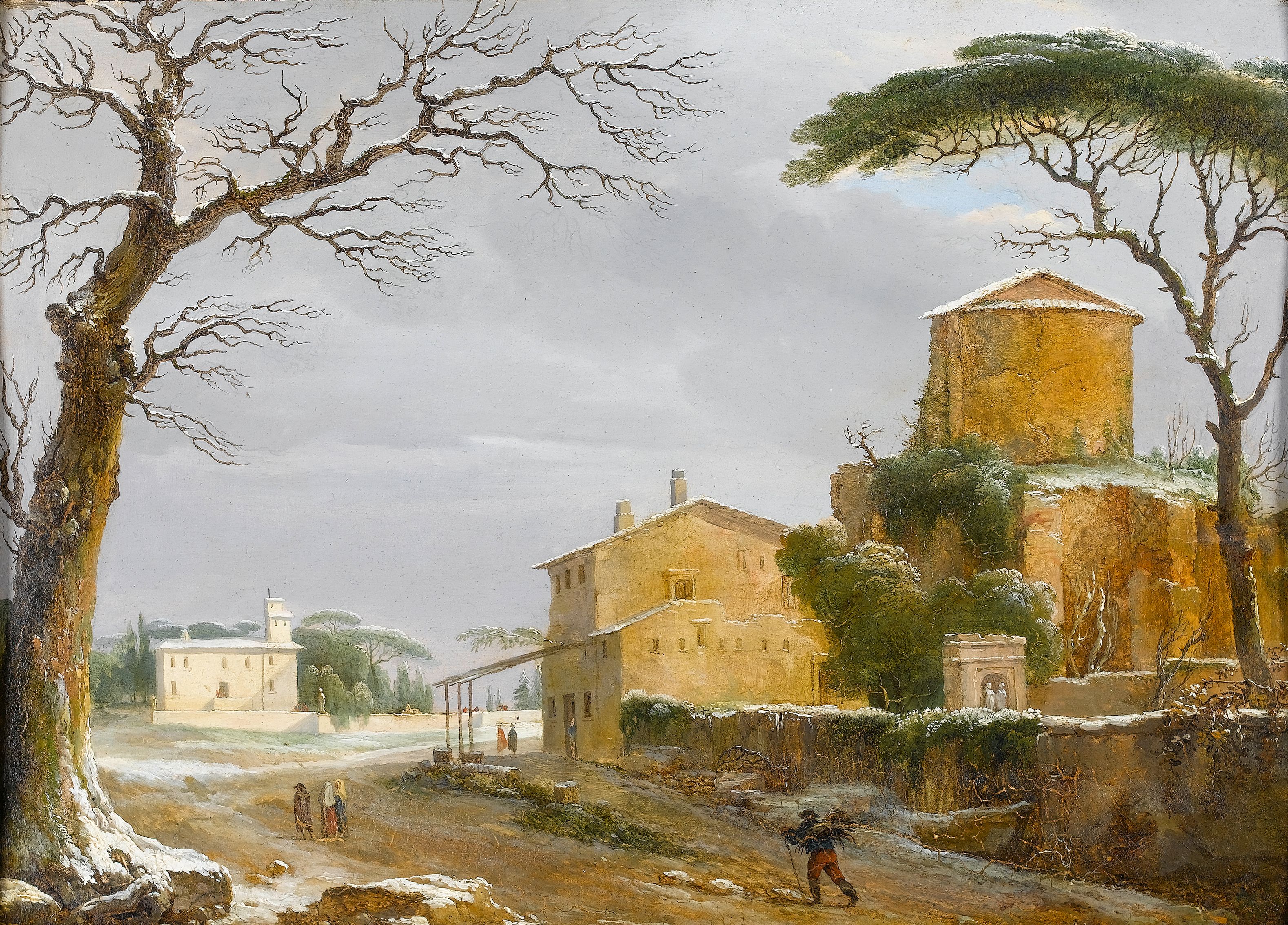A winter landscape with figures carrying firewood on a village path bears